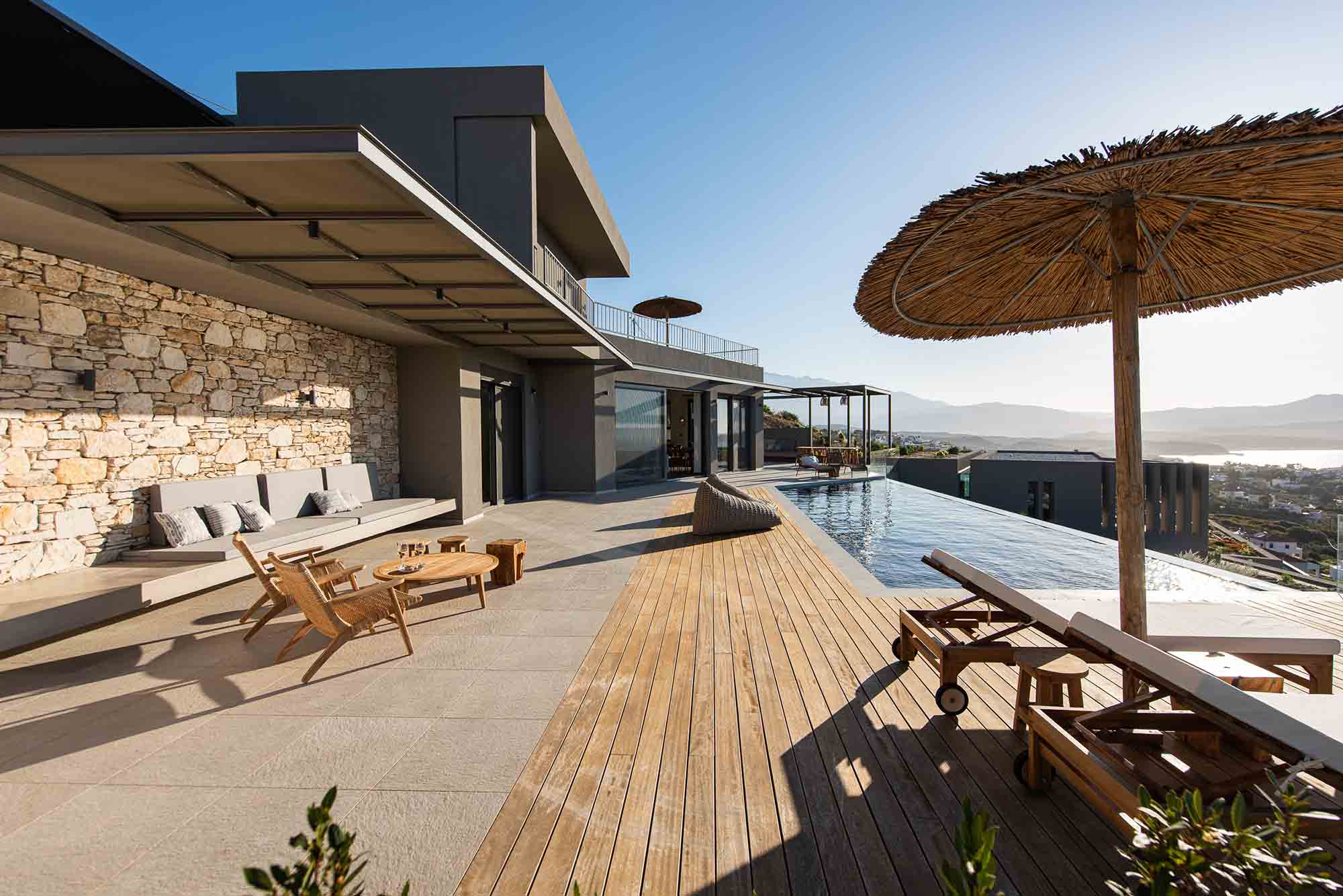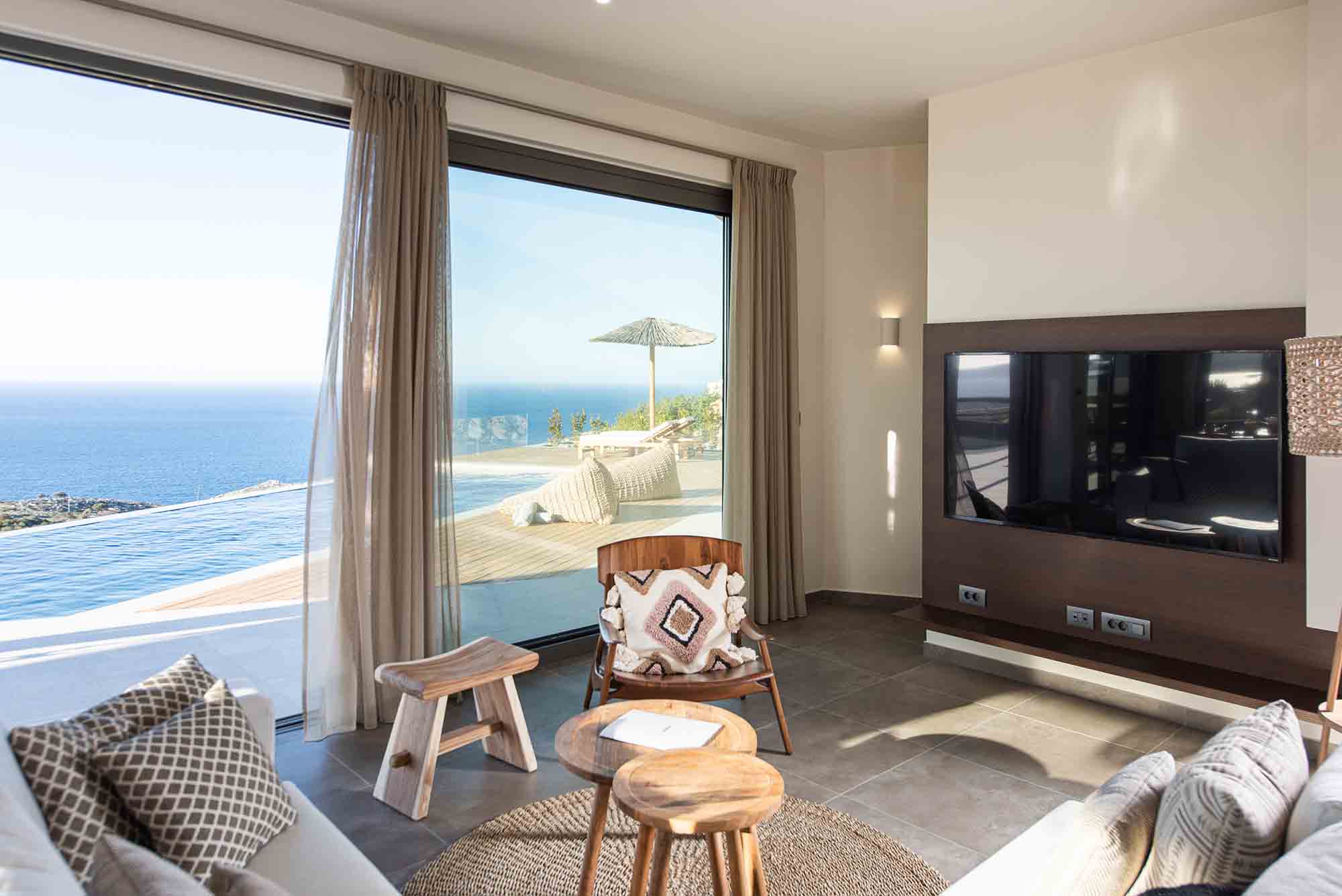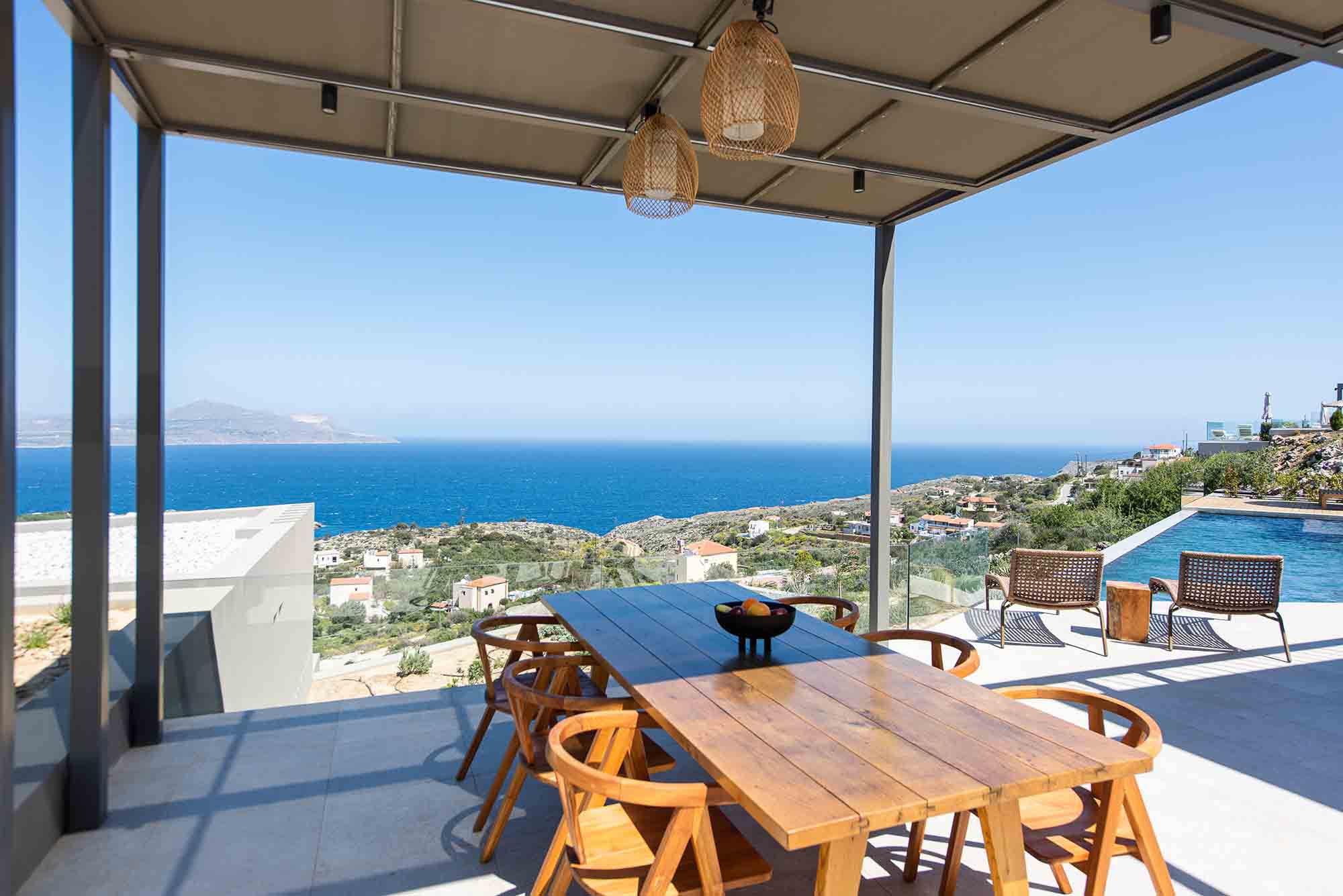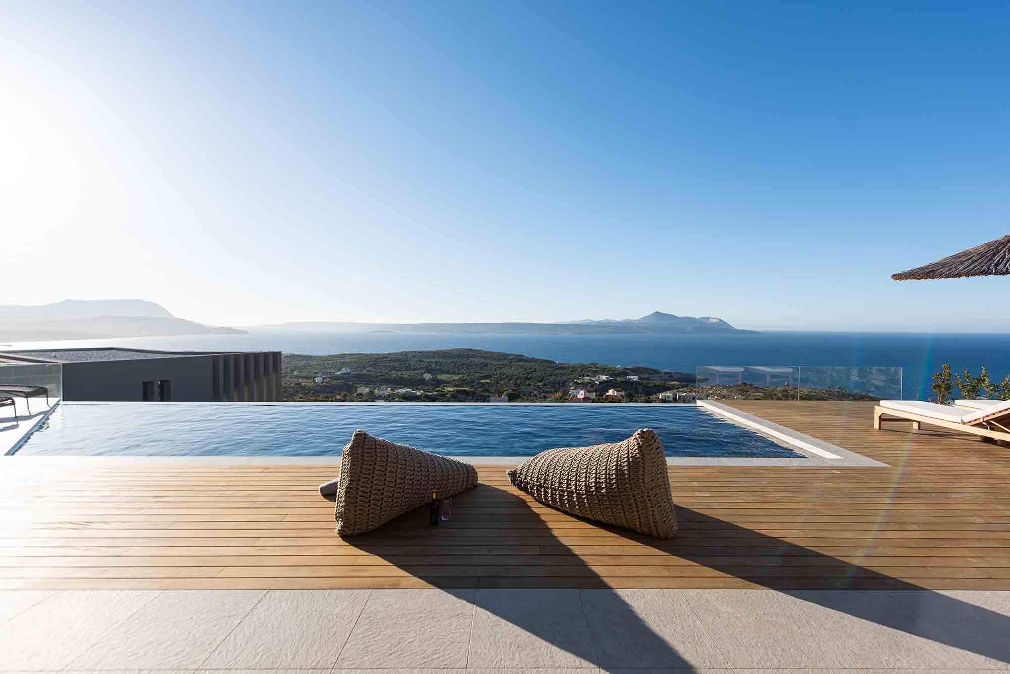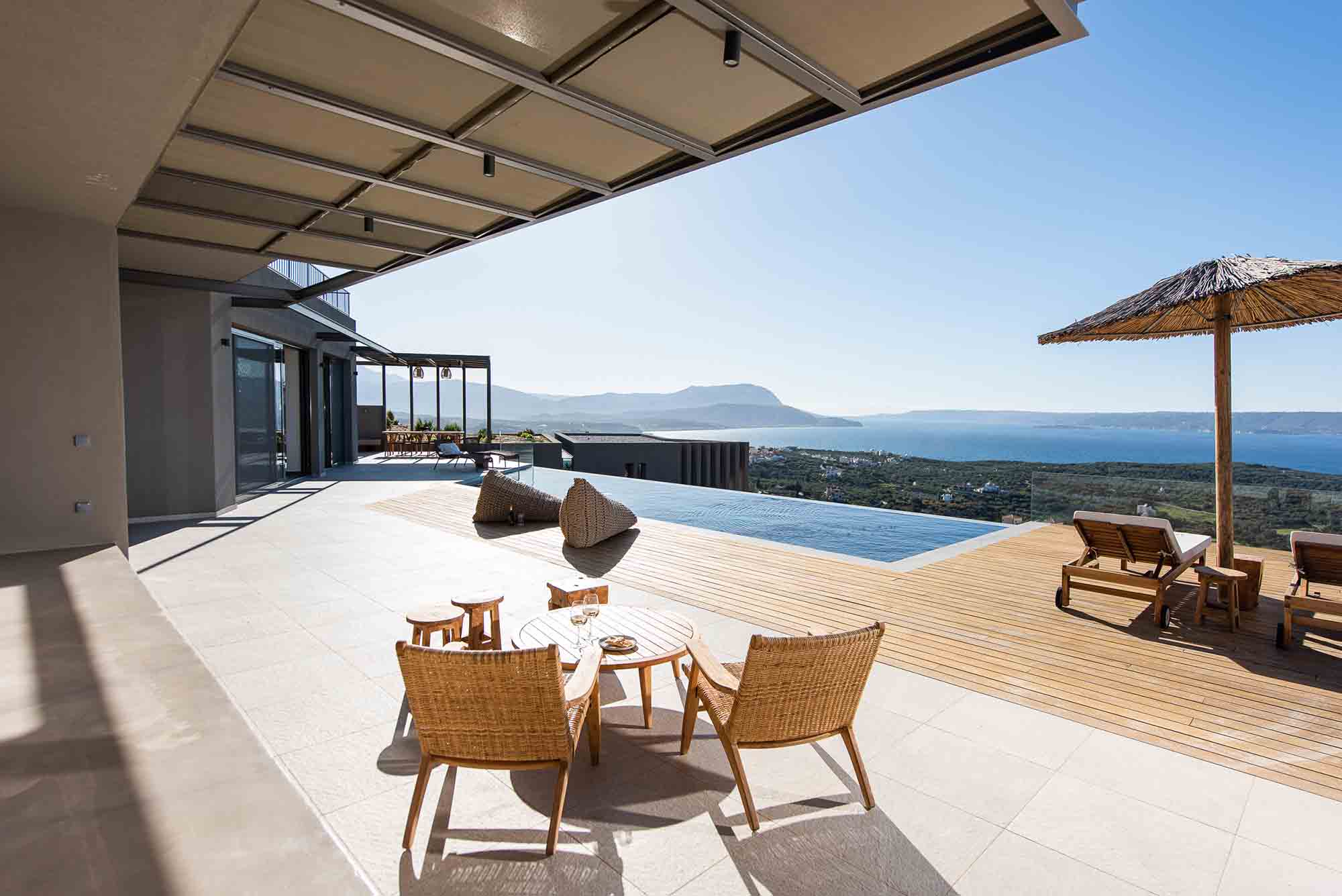 Inside, a spacious open-plan kitchen, dining, and lounge area complements the 5-star experience, providing the perfect haven for families and groups exploring Western Crete.