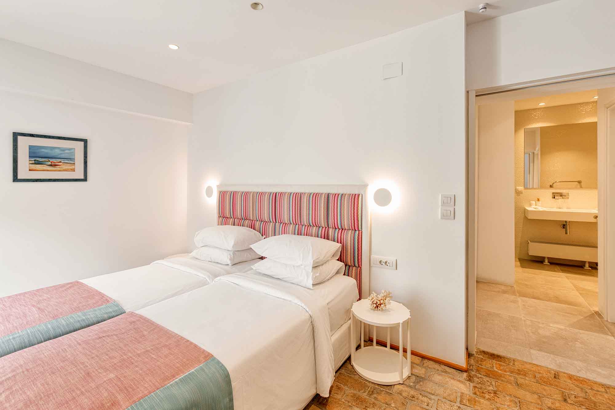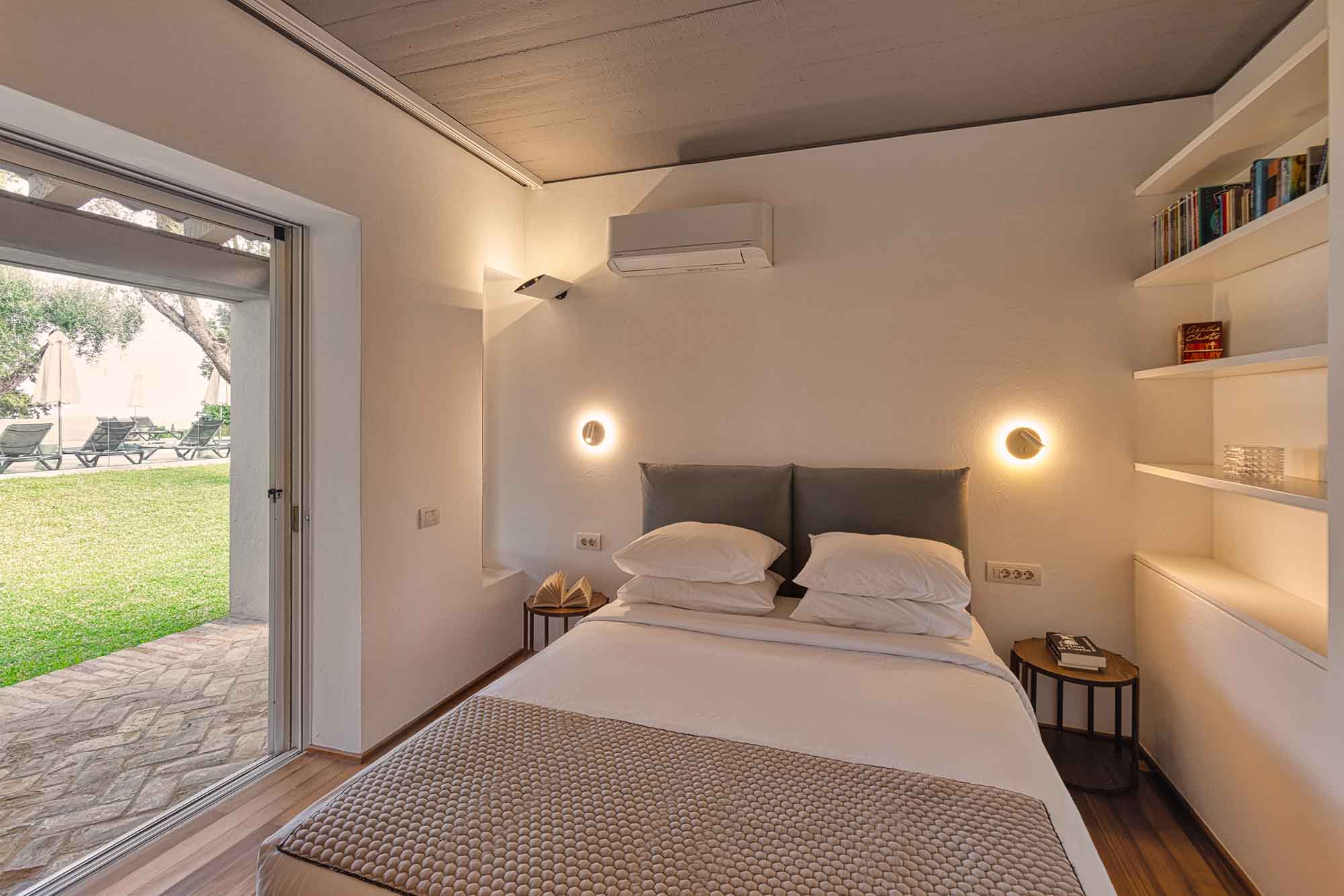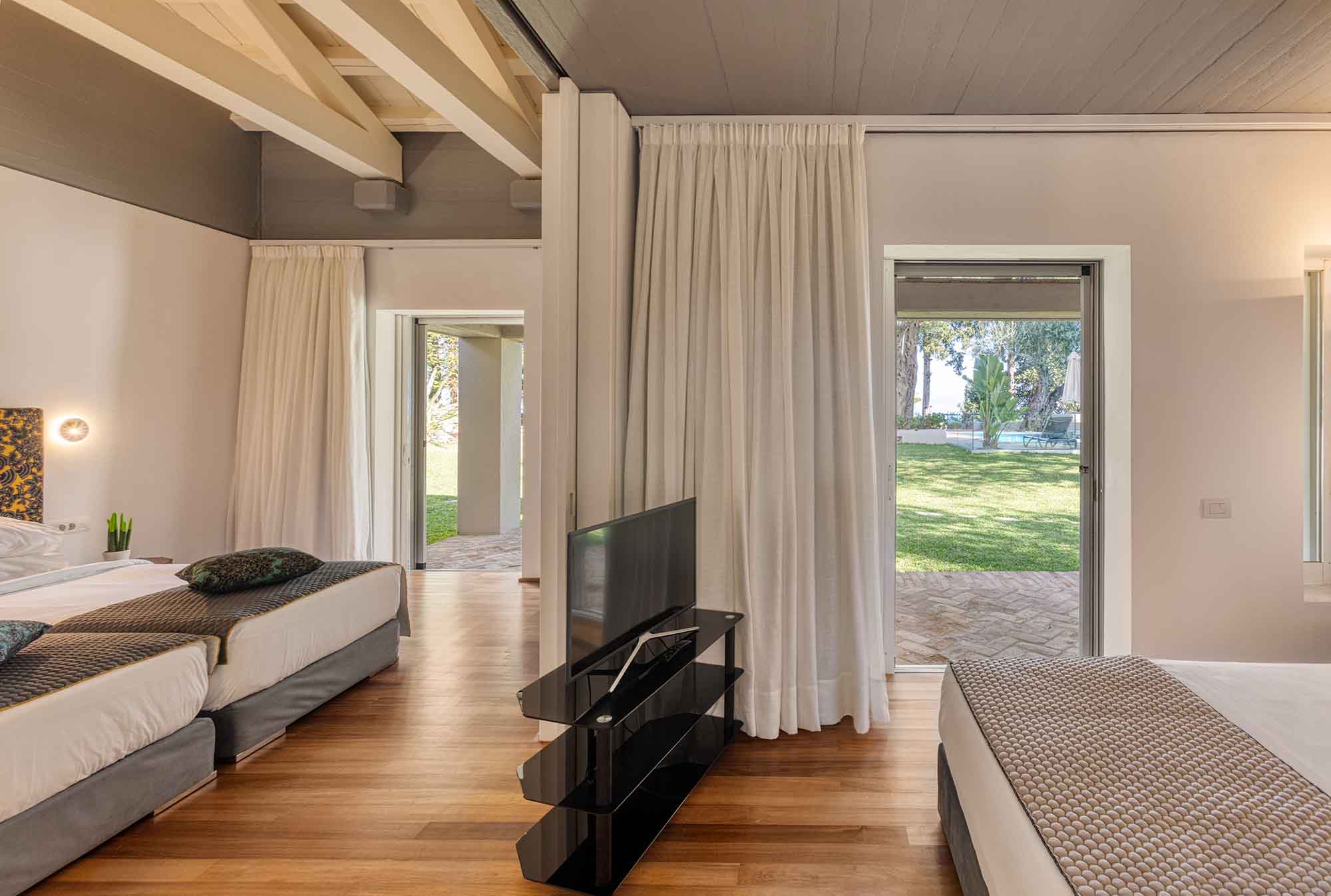 The interior design is enhanced by high wooden ceilings while the modern furniture blending with some ethnic pieces create a warm and relaxed ambience. The large window openings to the patio and the pool area gaze towards the sea and horizon. All bedrooms are spacious, airy and with plenty natural light and views.