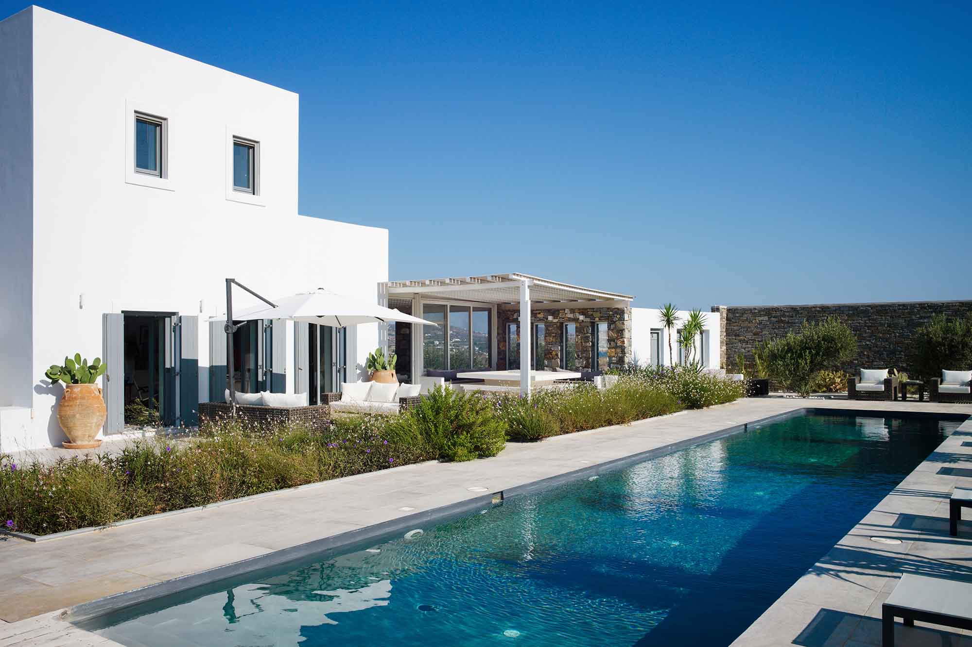 Villa Delos is a newly constructed property in the area of Pouli with uninterrupted views of Delos and Rhenia Islands, the energy center of the Cyclades. Tale has it that this particular location is ideal for finding your inner peace, relax and detox from your everyday life.