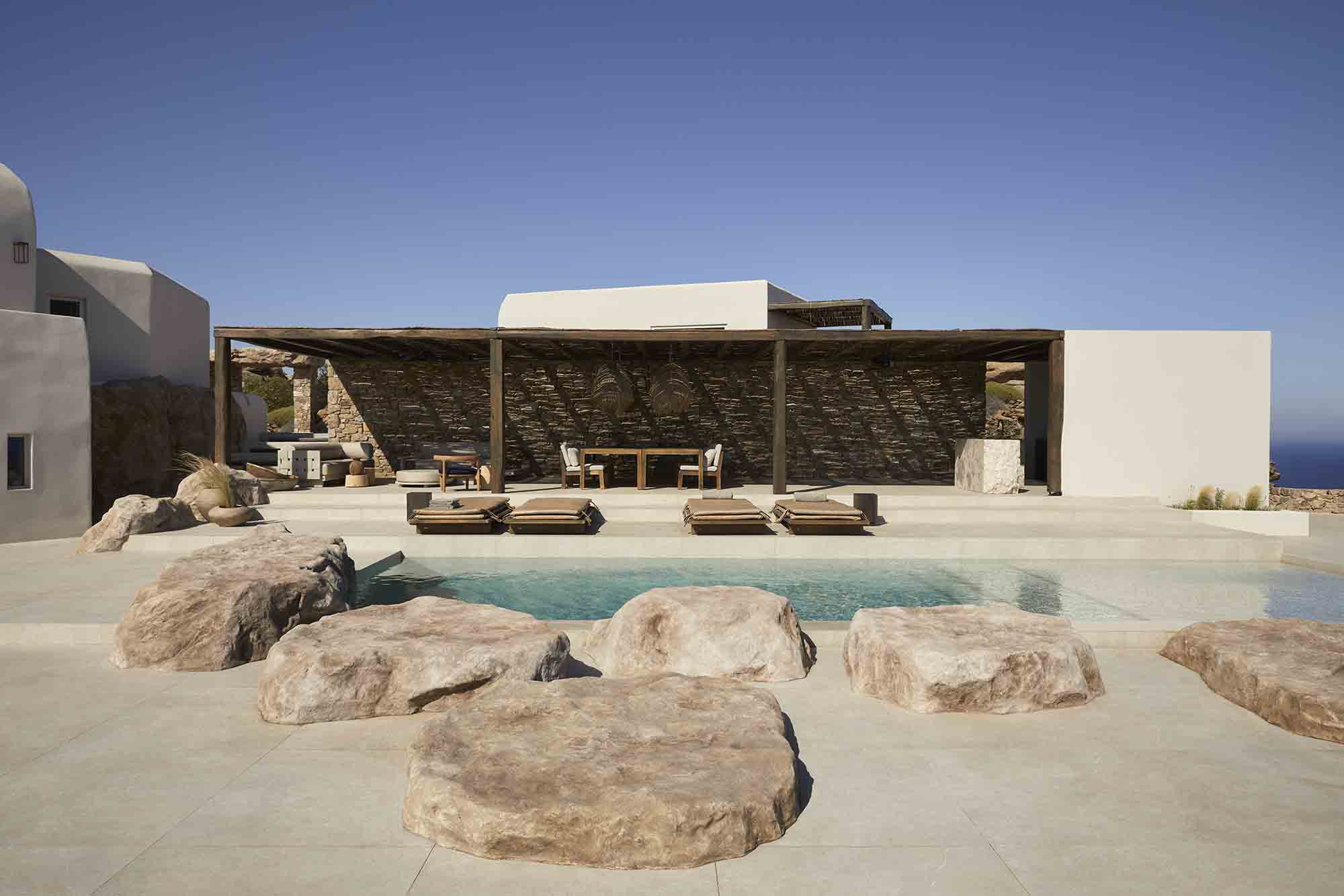 The outdoor area offers lounge and dining areas around the pool, with the views of the Aegean Sea and the horizon offers relaxation and tranquility. The interior offers minimal Cycladic lines with minimal touches and simple yet luxurious materials.