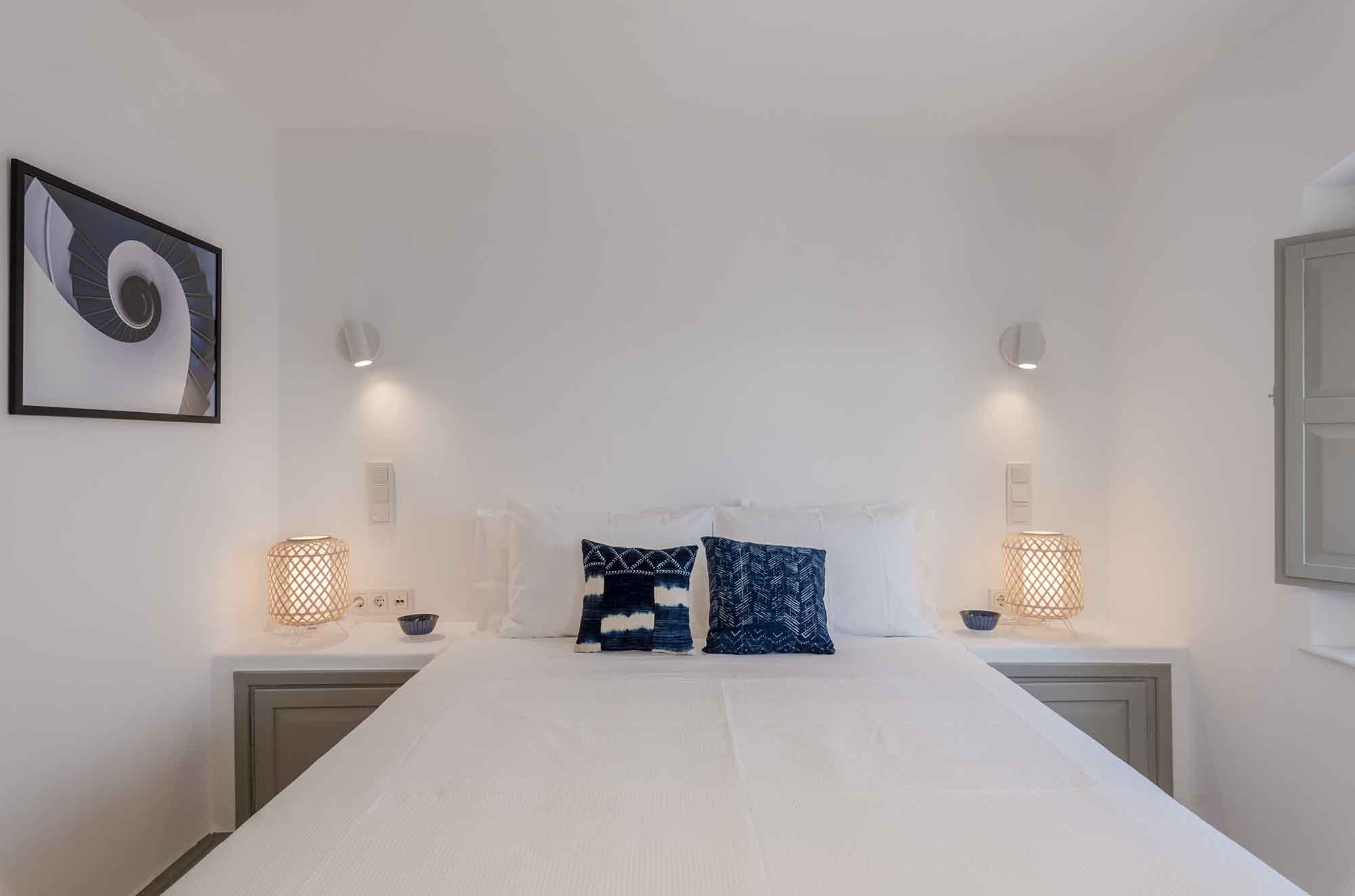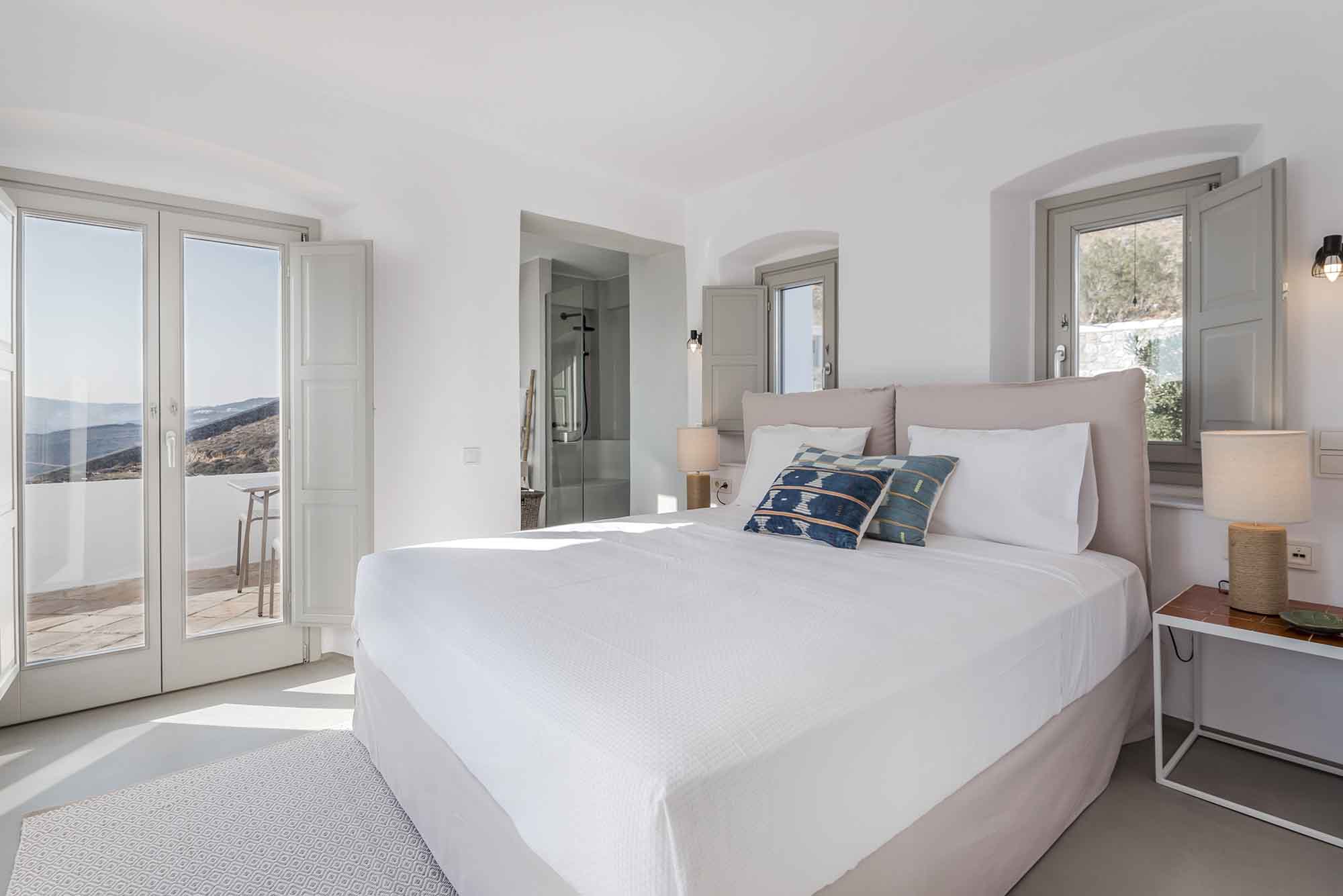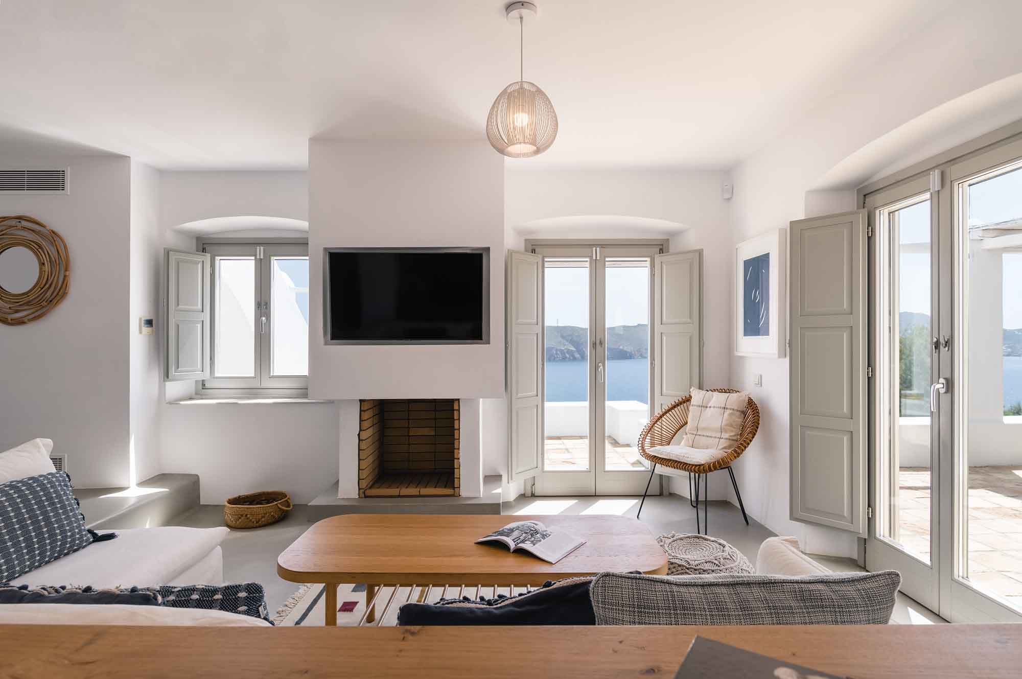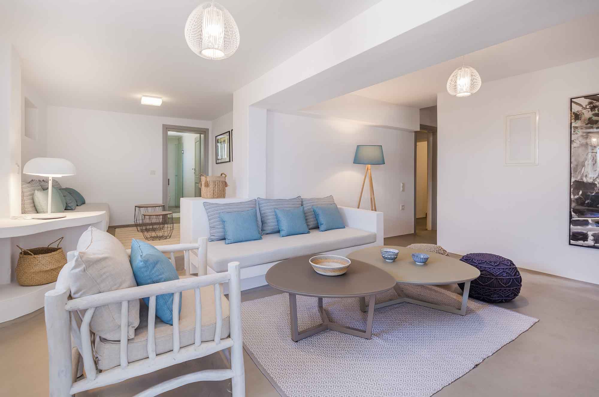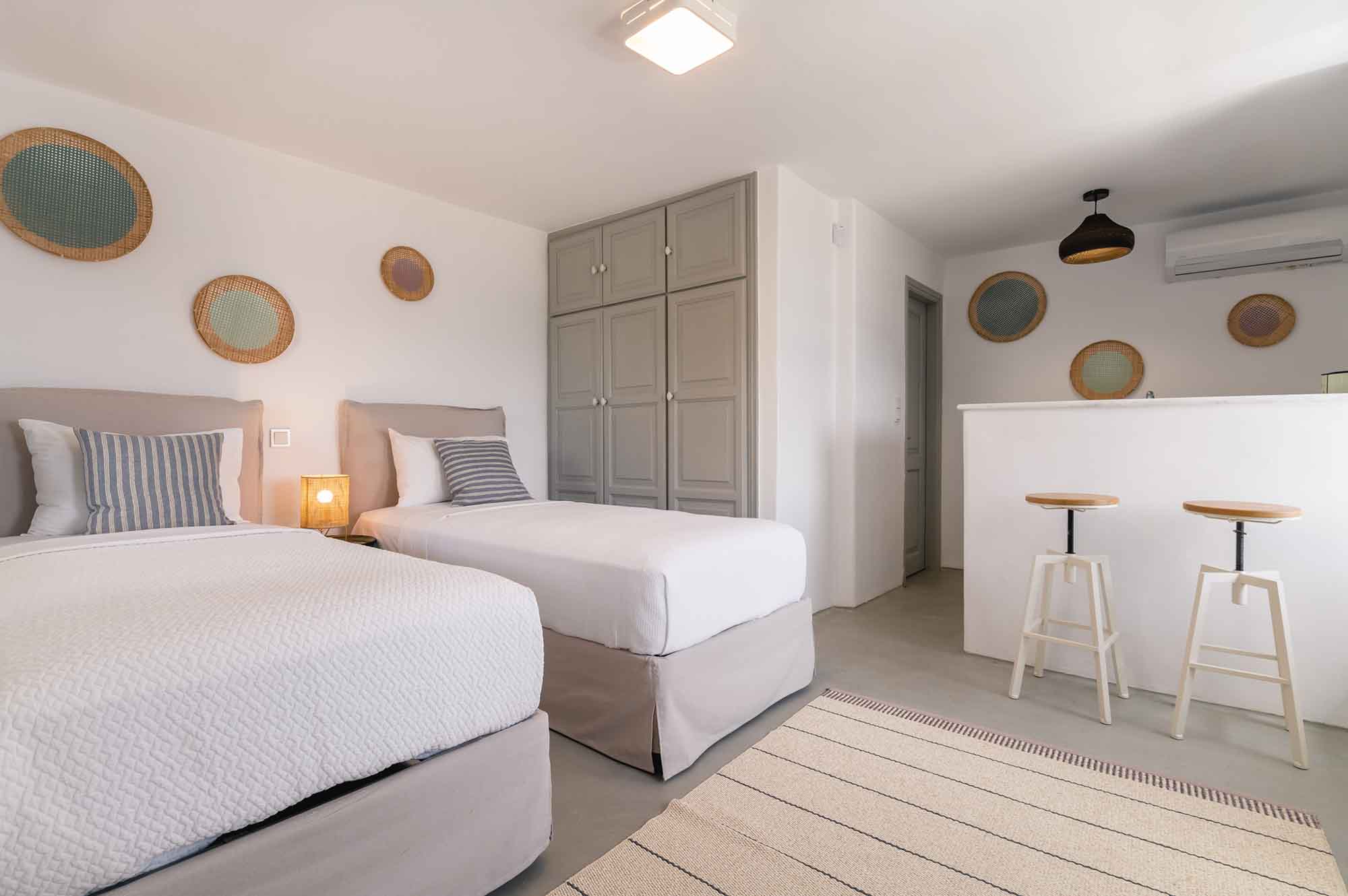 Villa Goldie unfolds in 435 sq.m and extends on a plot of 4,000 sq.m offering spaces to relax in privacy yet to gather to enjoy the sunset and drinks by the pool area. It has been fully renovated in 2019 and consisted of 3 levels, providing in total six double bedrooms to accommodate 12 guests. The interior is designed to find natural light in all spaces while white colour prevails in most furniture and fabrics. The natural ambience plays harmoniously with elements of light wood to create a home away from home feelings throughout all the living spaces. Same pattern prevails in all bedrooms and bathrooms which have been designed to offer all modern amenities and features. Yet the best highlight is the sea views and the uninterrupted gaze of the clear horizon.