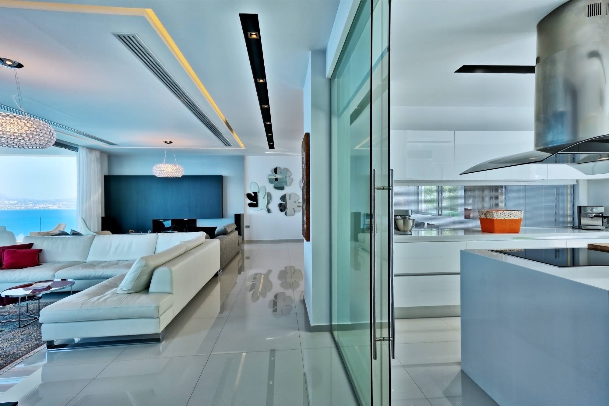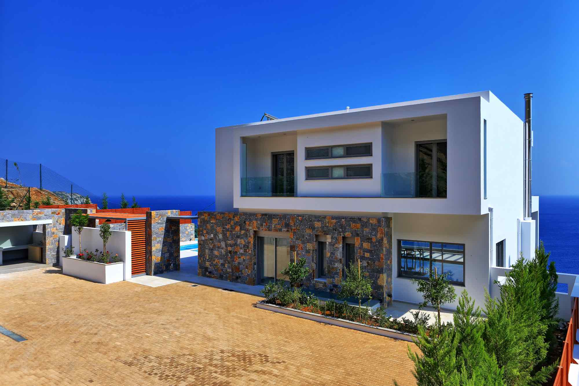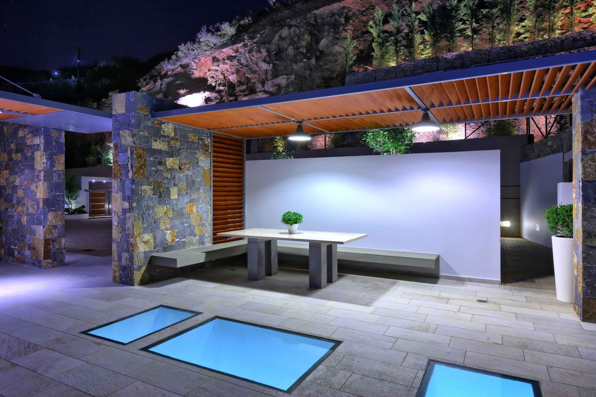 The outdoor spaces include two large terraces offering a stunning view which starts with the island of Dia on the left, the port, the castle, and the entire city from east to west. While away the hours in the amazing seawater swimming pool, double whirlpool jacuzzi, large pool terrace, and enjoy the amazing outdoor dining area with concrete benches and a stunning marble table. There is also an amazing ergonomic zone for preparing traditional dishes featuring a wood-fired oven, barbeque and a range of other cooking equipment.