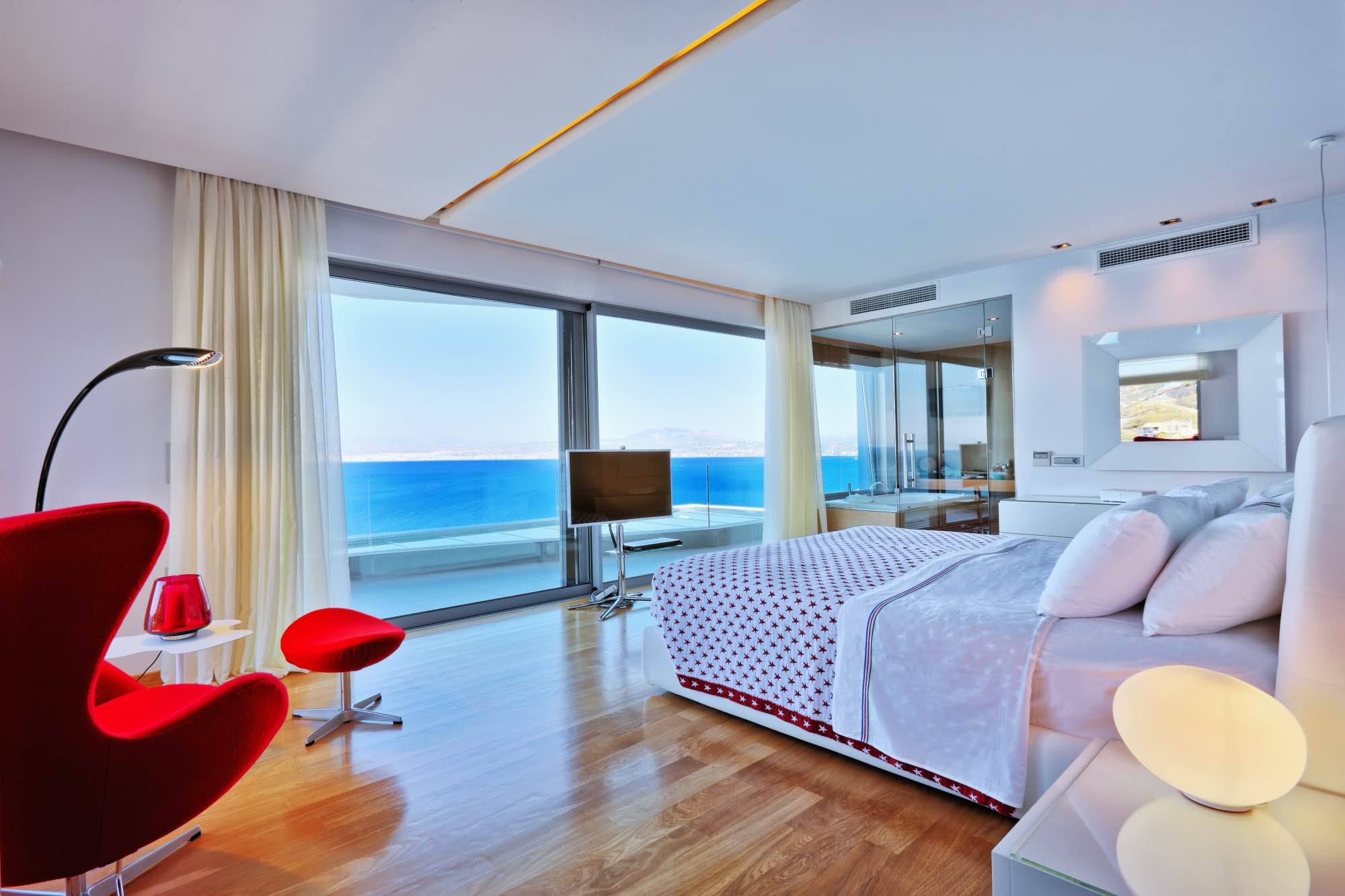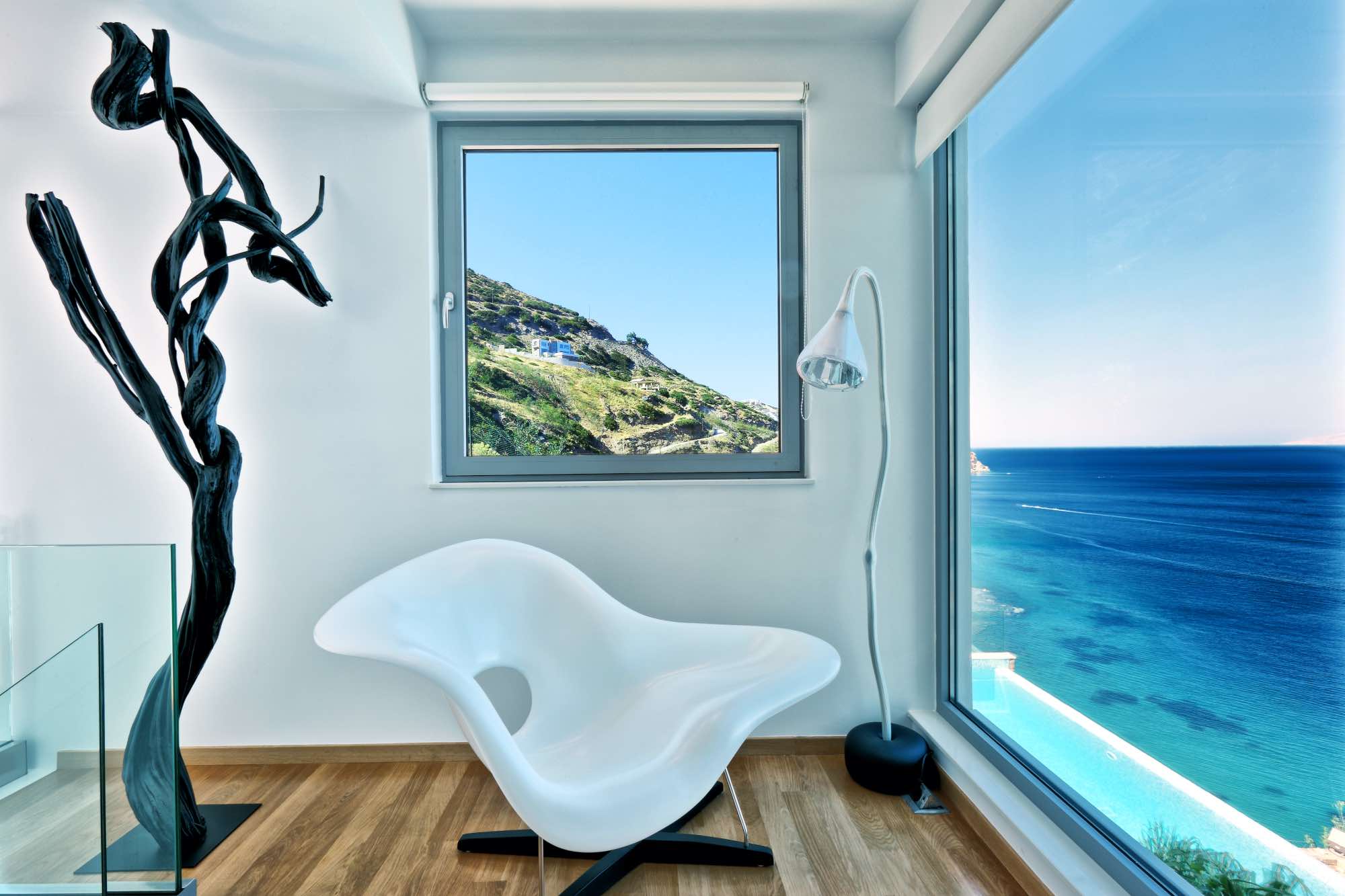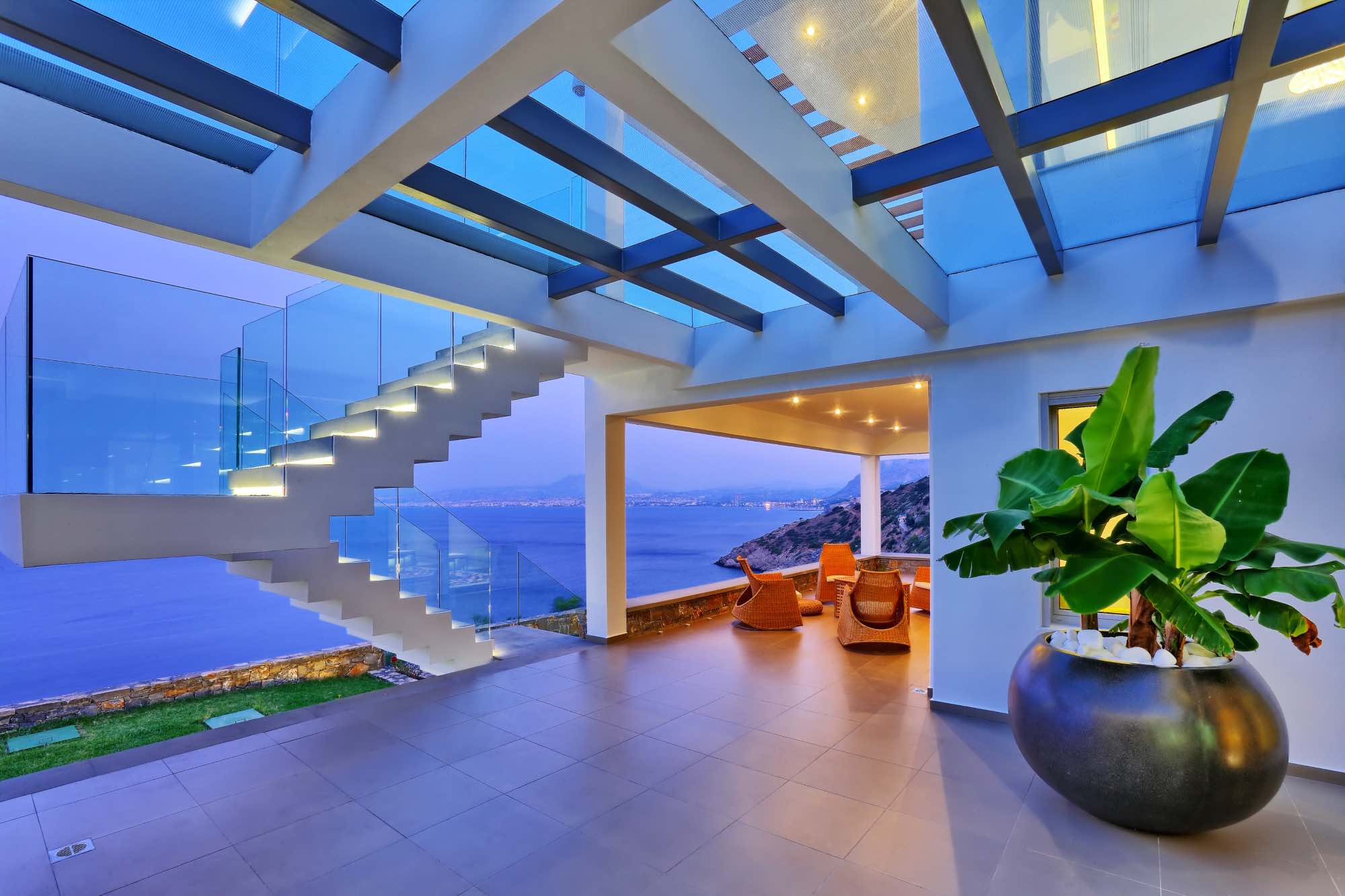 The outdoor spaces include two large terraces offering a stunning view which starts with the island of Dia on the left, the port, the castle, and the entire city from east to west. While away the hours in the amazing seawater swimming pool, double whirlpool jacuzzi, large pool terrace, and enjoy the amazing outdoor dining area with concrete benches and a stunning marble table. There is also an amazing ergonomic zone for preparing traditional dishes featuring a wood-fired oven, barbeque and a range of other cooking equipment.