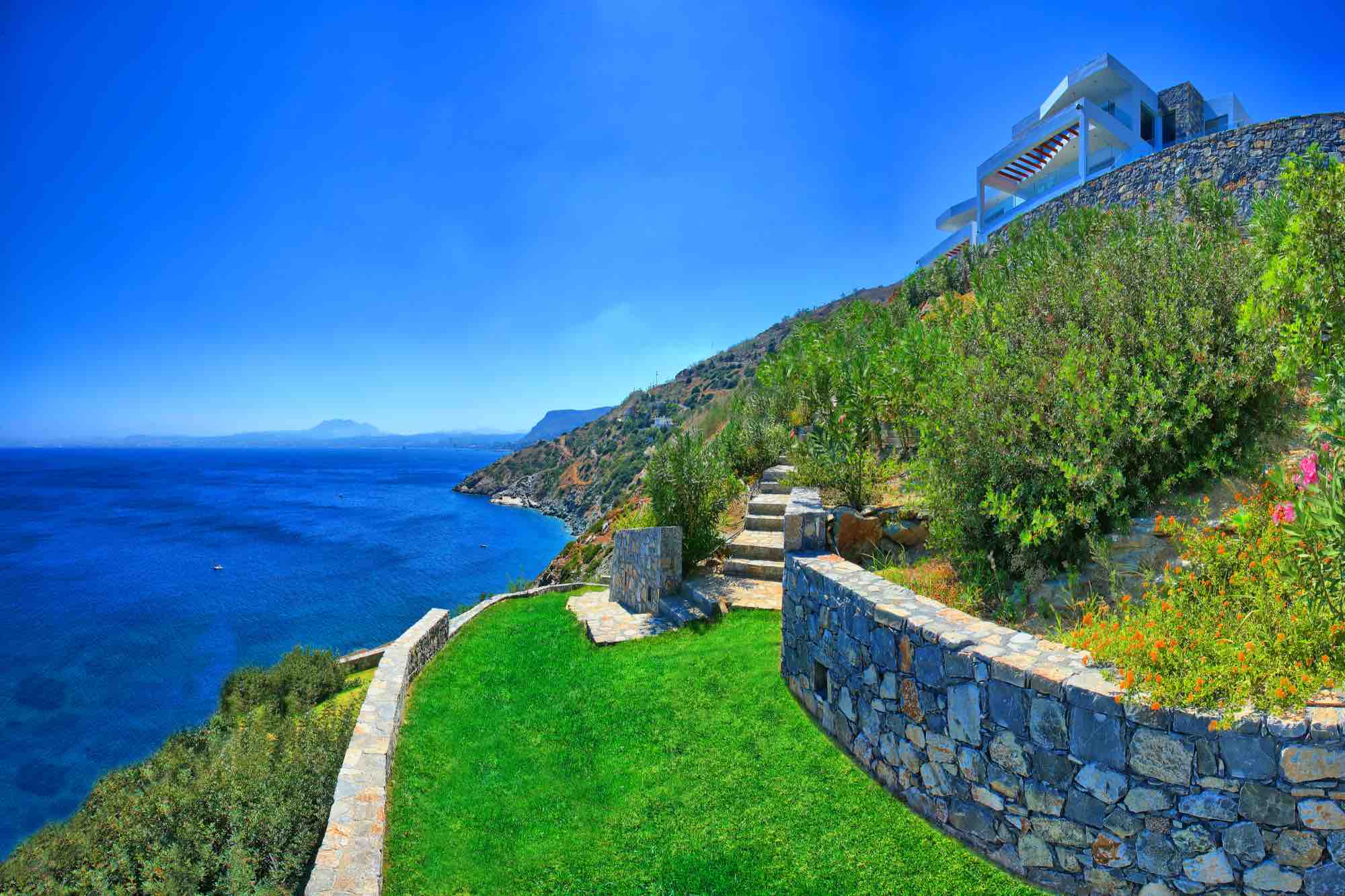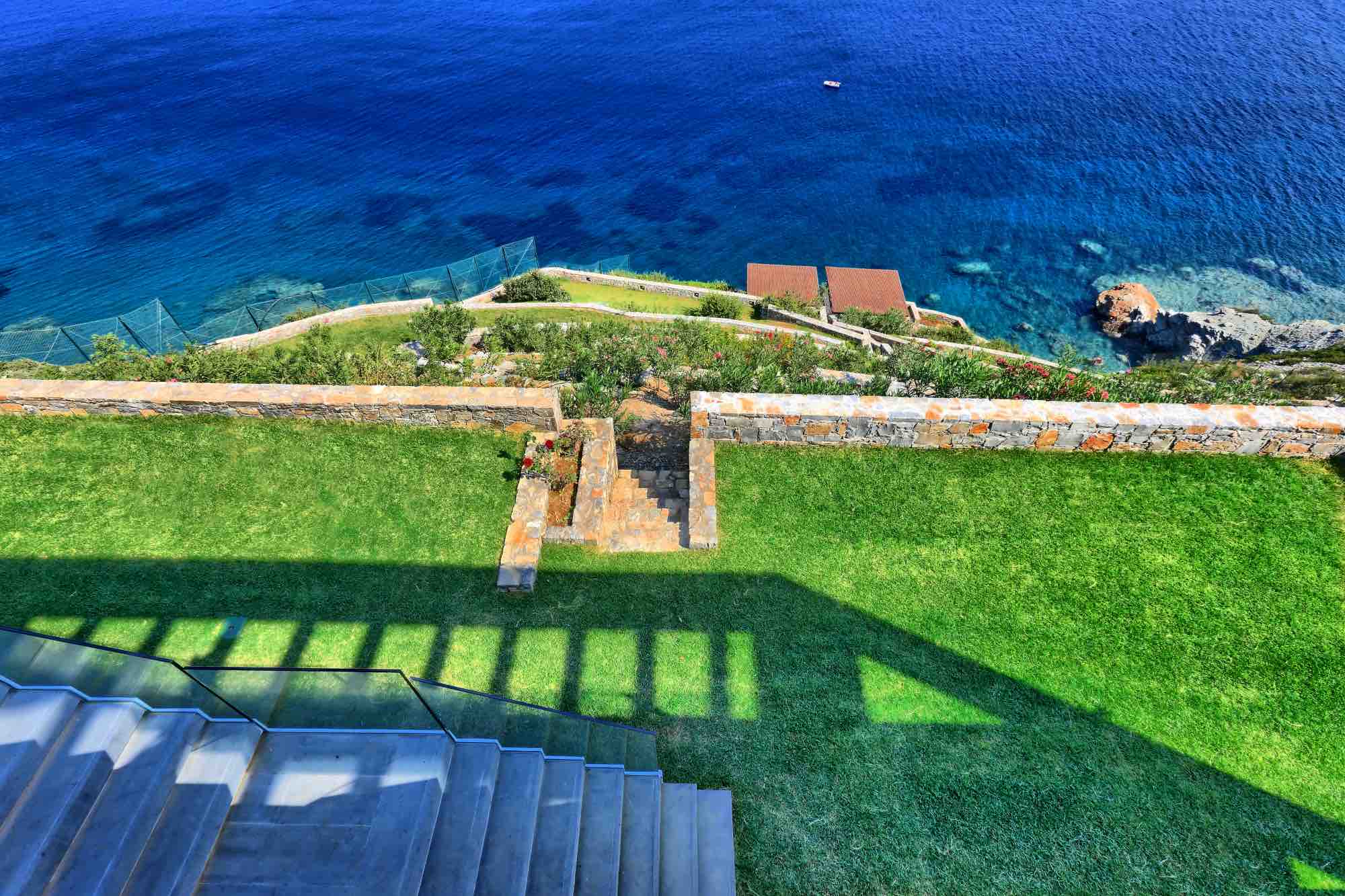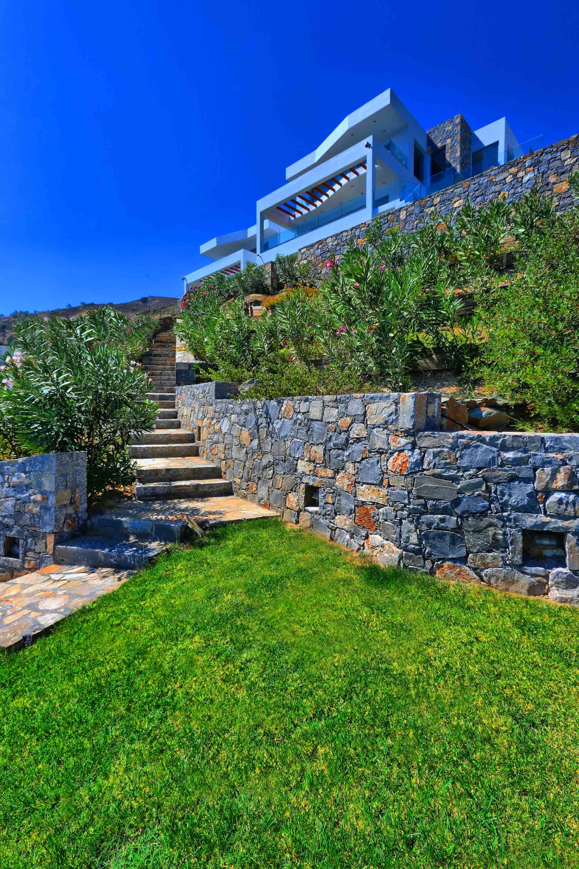 Between the villa’s terraces and the sea are a series of retaining walls of various heights made of local stone planted richly with shrub and tree species that flourish in the area. Not only are they amazing to look at, but they also fill the air with the wonderful scents of the Cretan countryside.