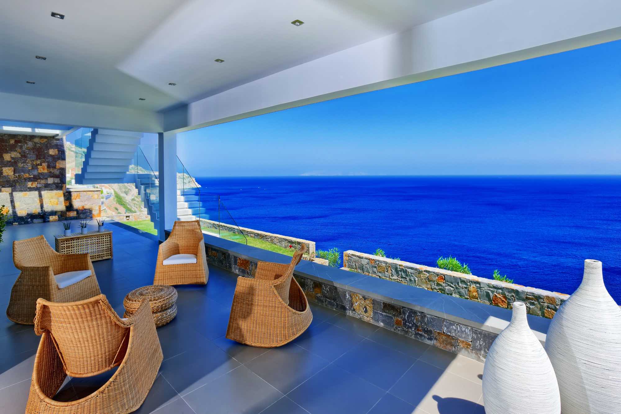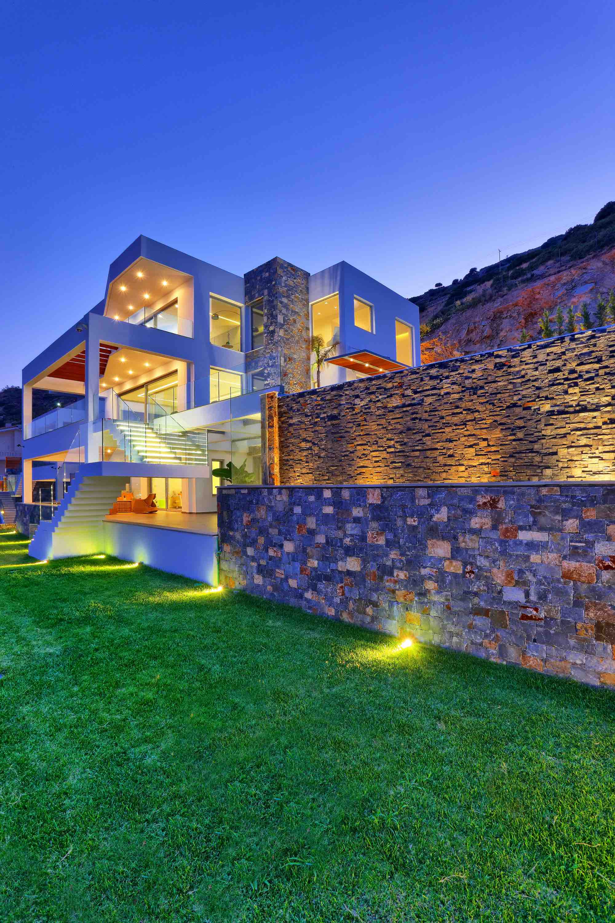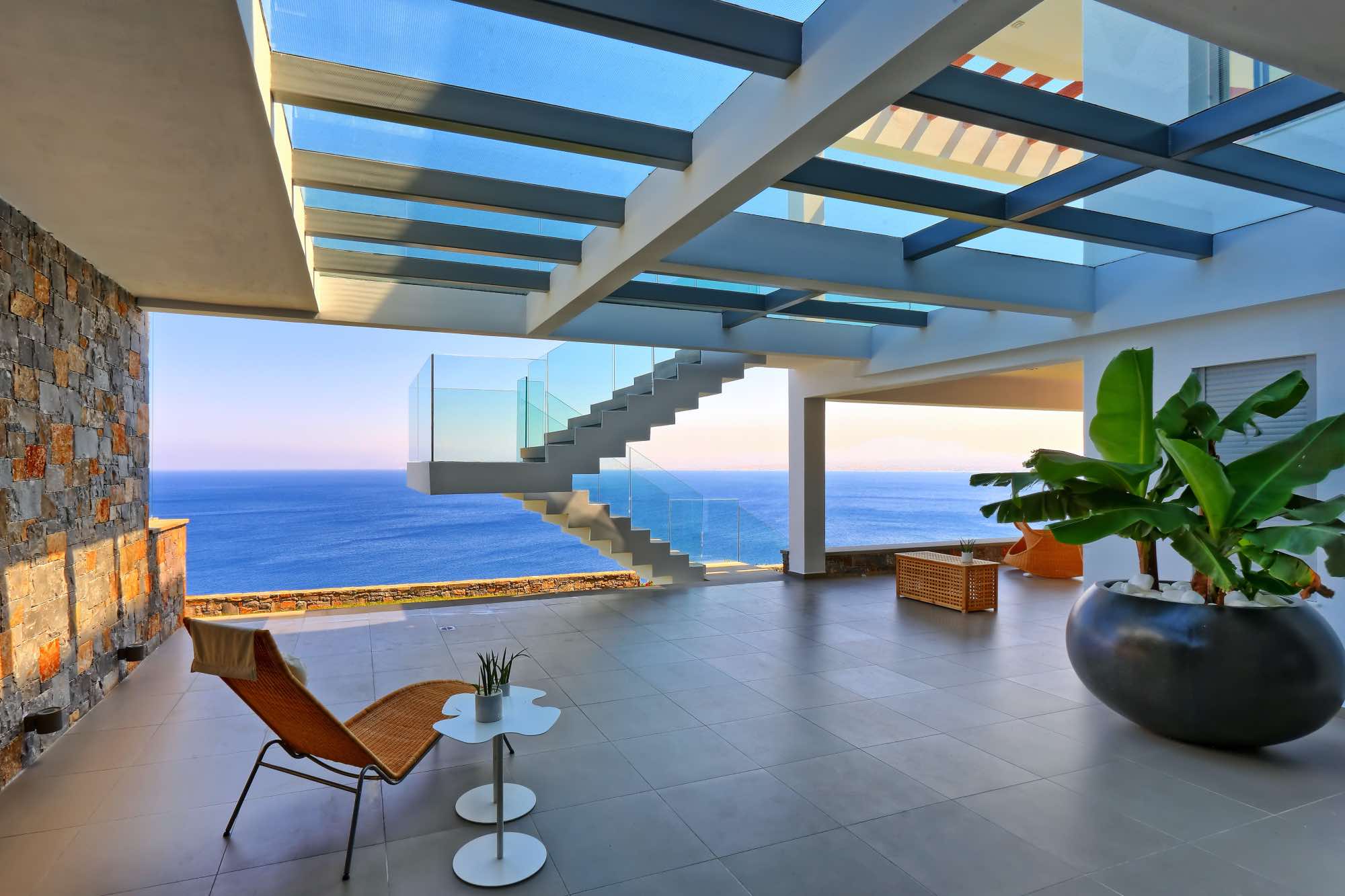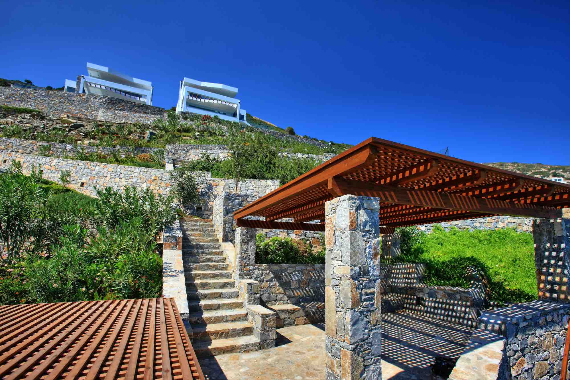 Between the villa’s terraces and the sea are a series of retaining walls of various heights made of local stone planted richly with shrub and tree species that flourish in the area. Not only are they amazing to look at, but they also fill the air with the wonderful scents of the Cretan countryside.
