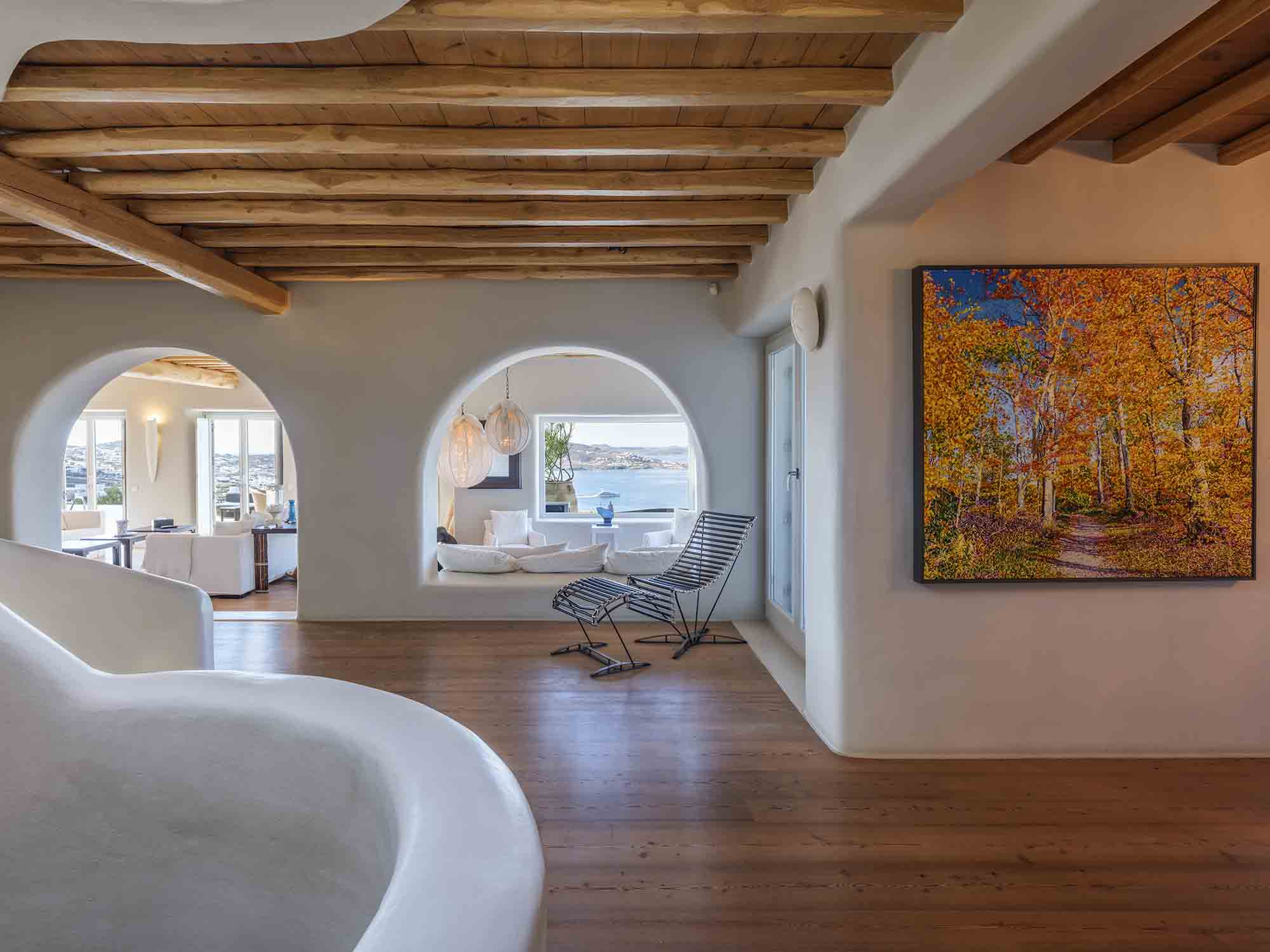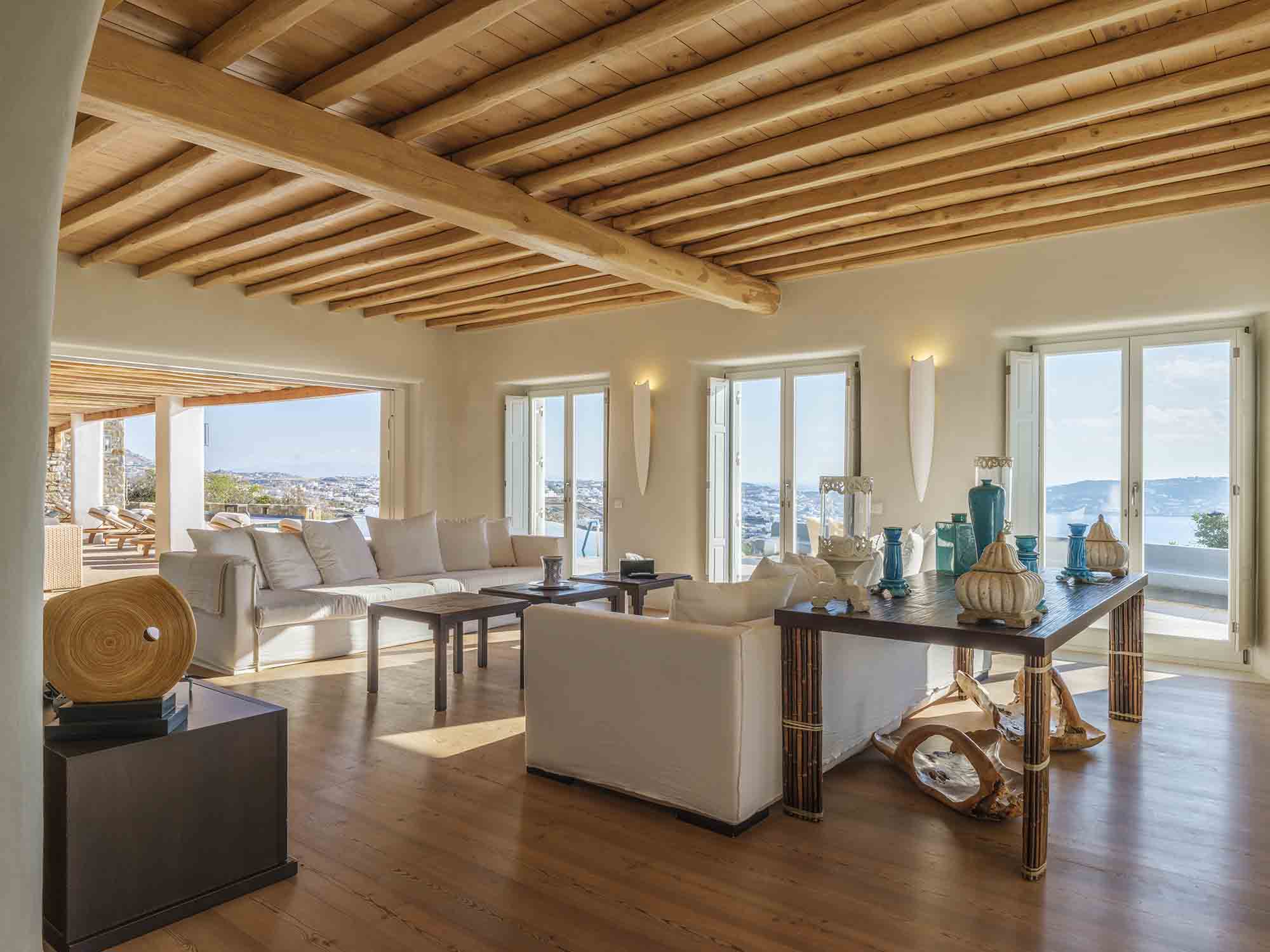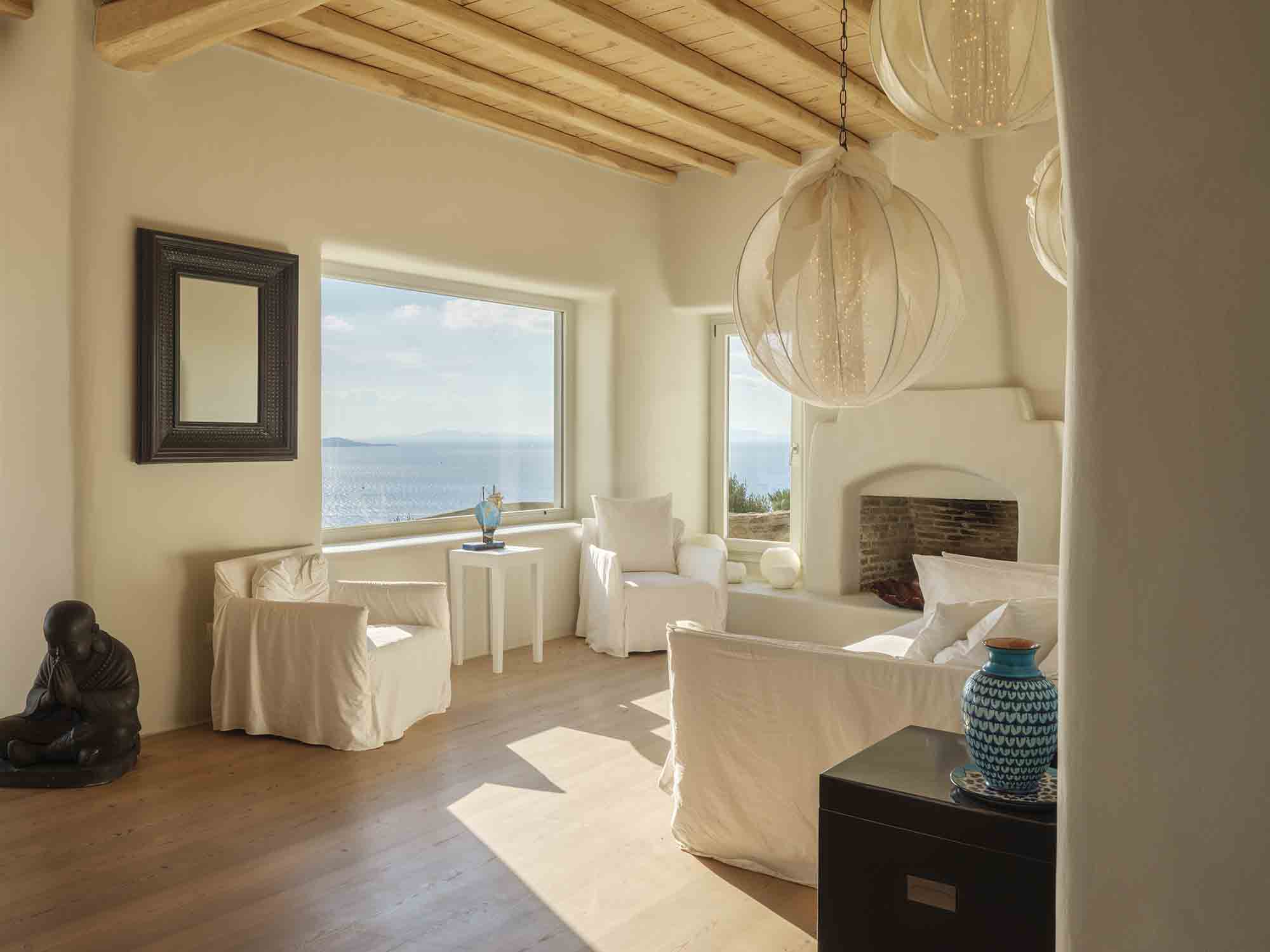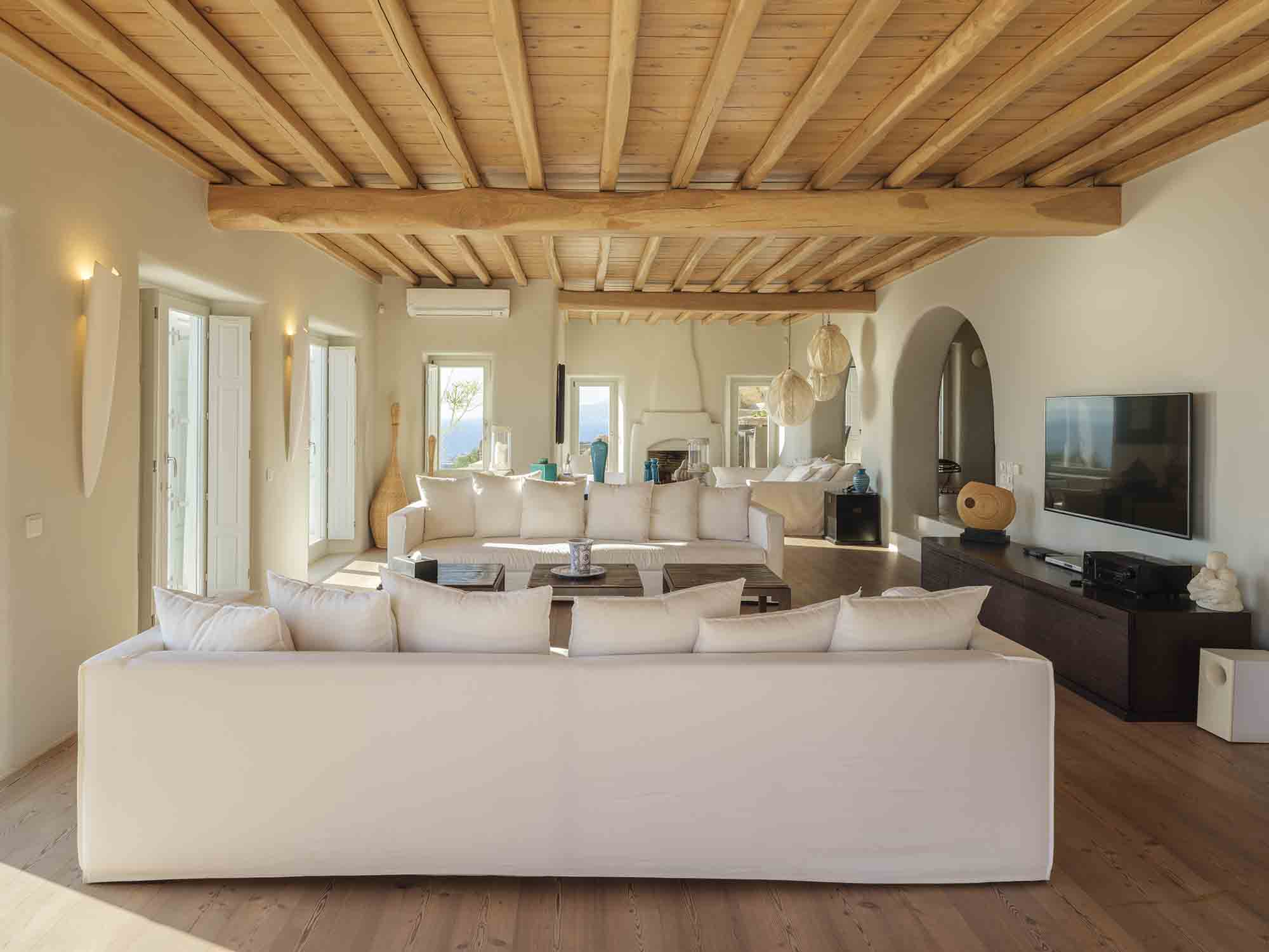 The decoration and the style of the interior is carefully cared with fine materials and elegant lines. Cycladic architecture style finds a fascinating expression in this luxurious property, with whitewashed areas retaining the minimal flair, so that the overall design details to be displayed at the most.