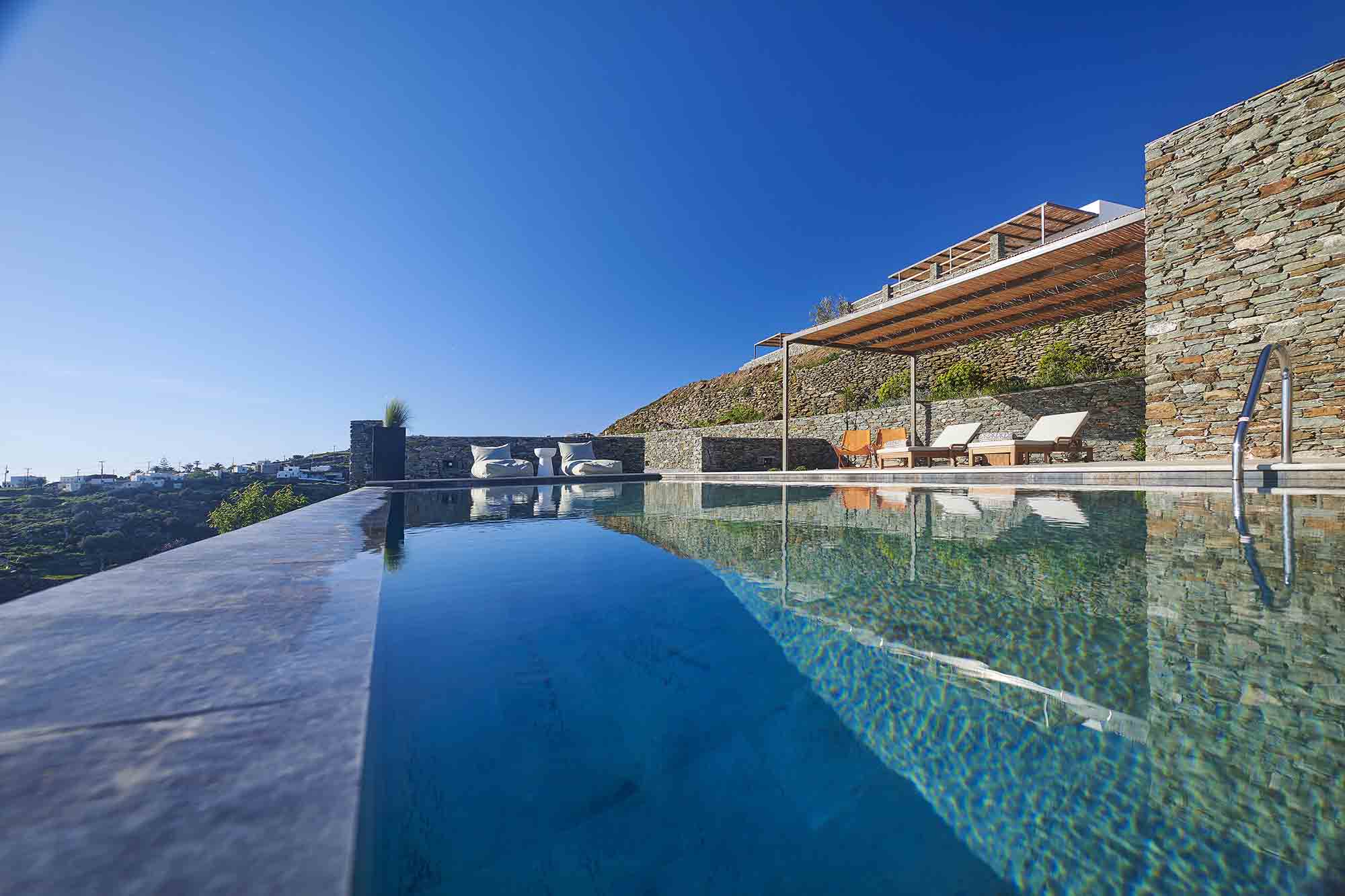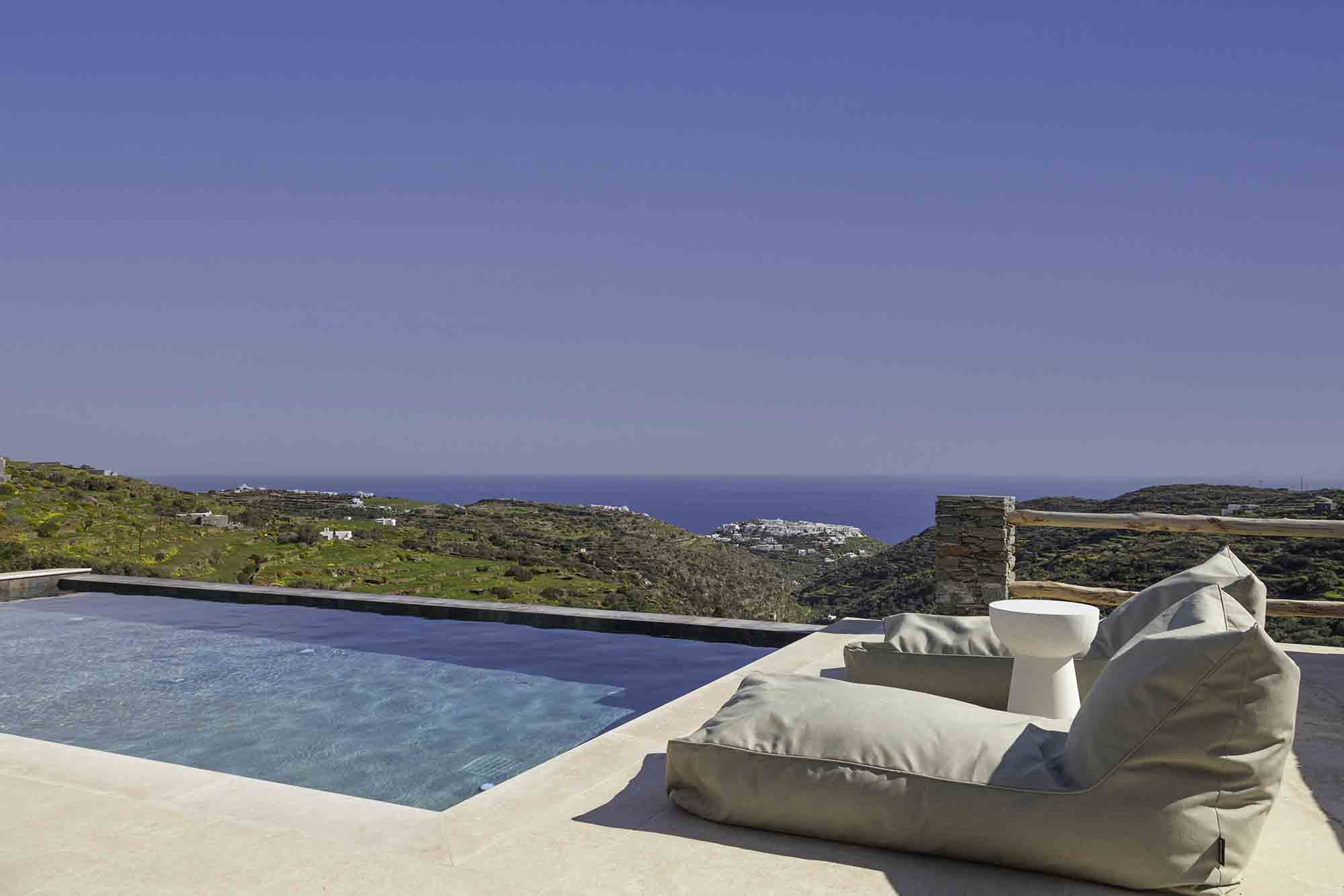 From every corner of the residence, your gaze is drawn to the unparalleled vistas overlooking the historic settlement of Kastro, the endless blue of the Aegean Sea, and the islands of Syros, Tinos, Mykonos, Paros, and Delos. The two infinity pools appear to merge with the horizon, evoking a captivating sense of tranquility beyond spaces.