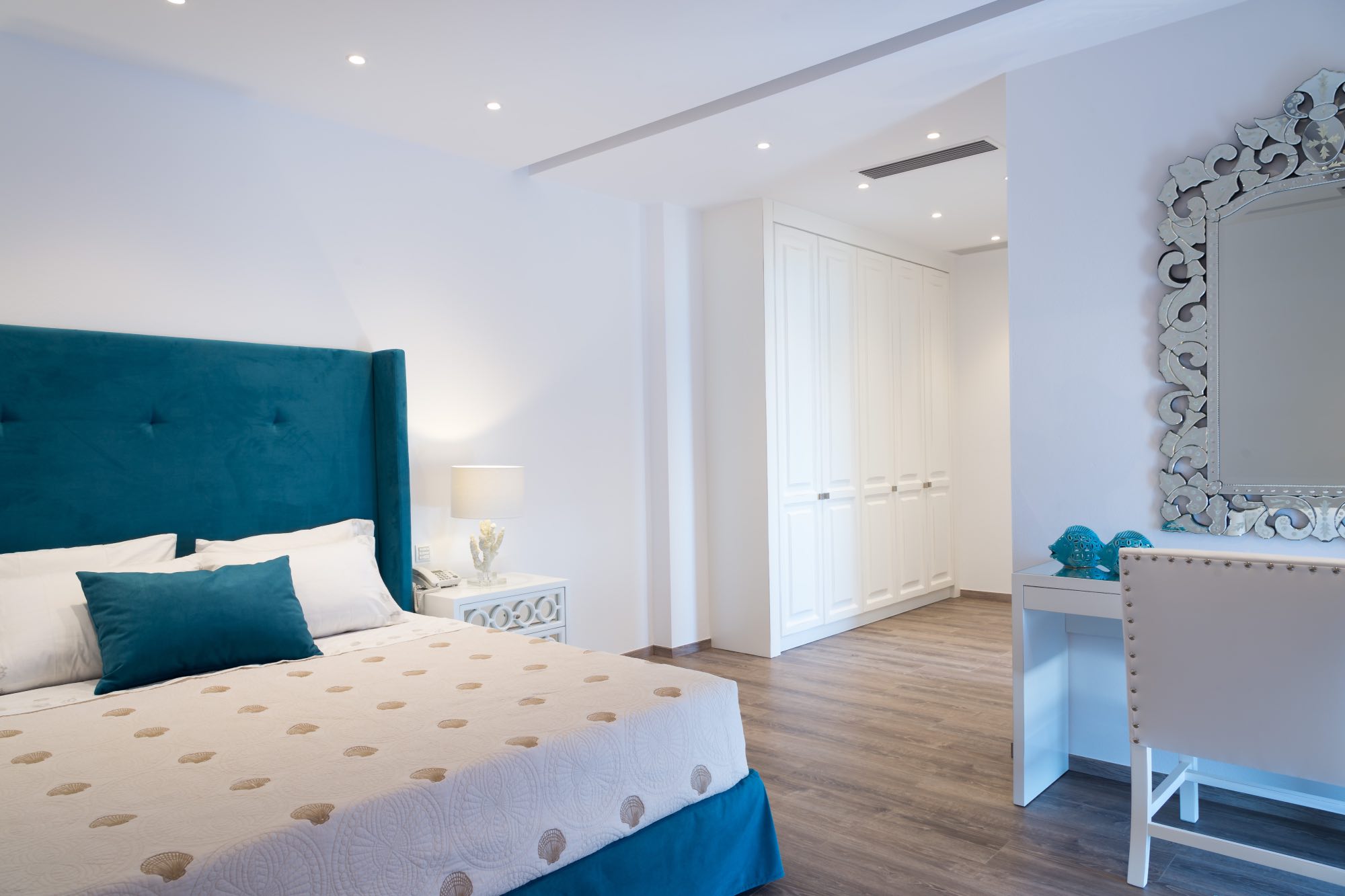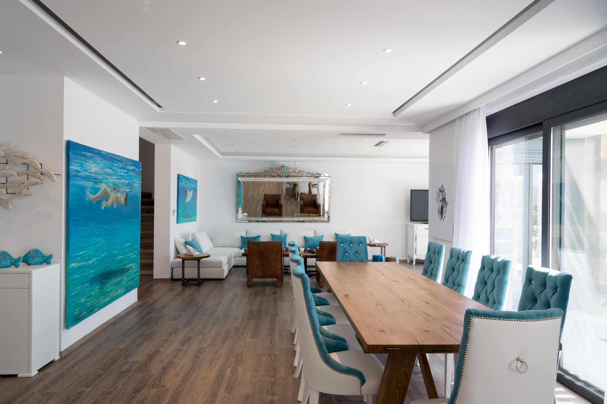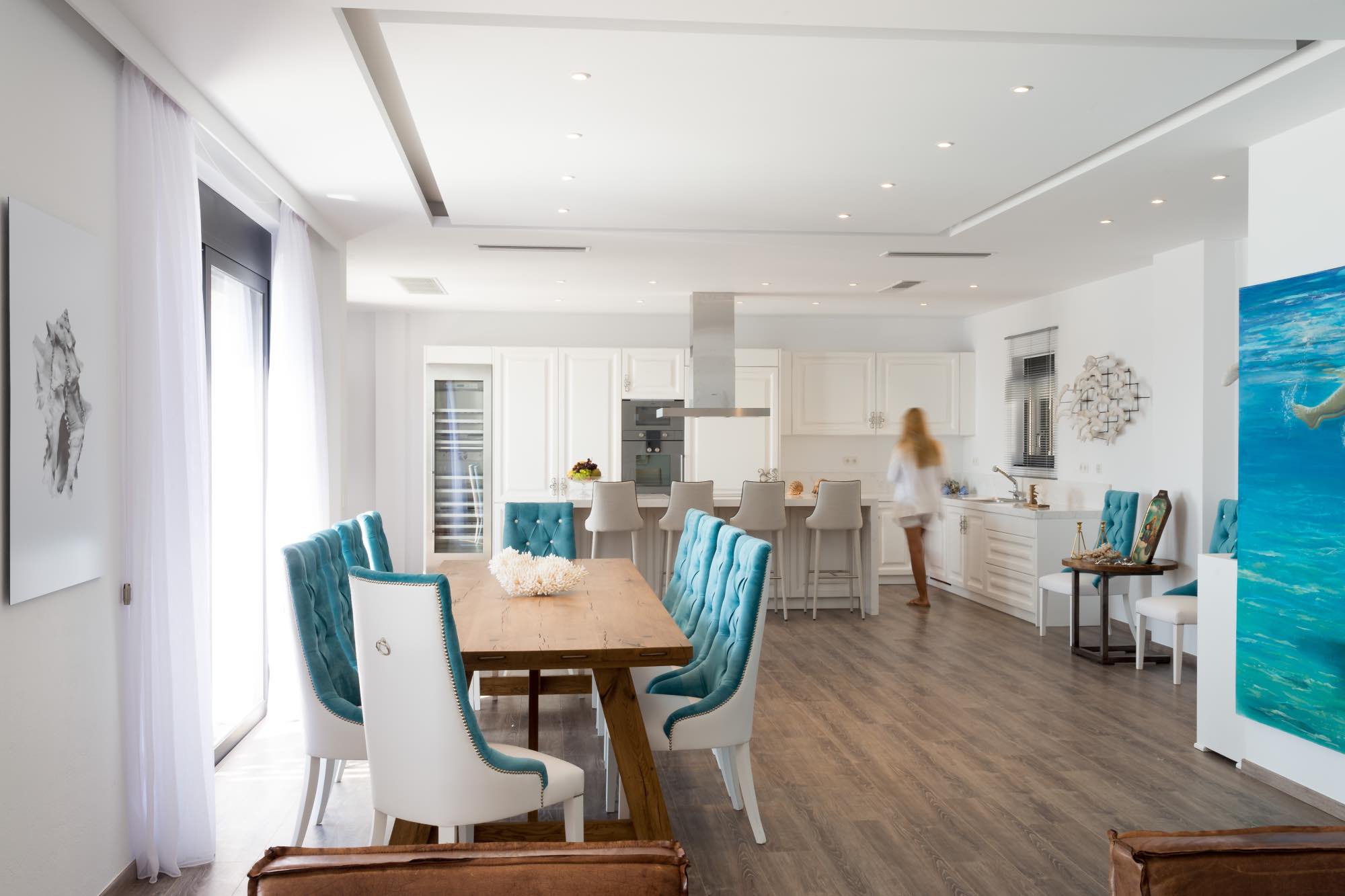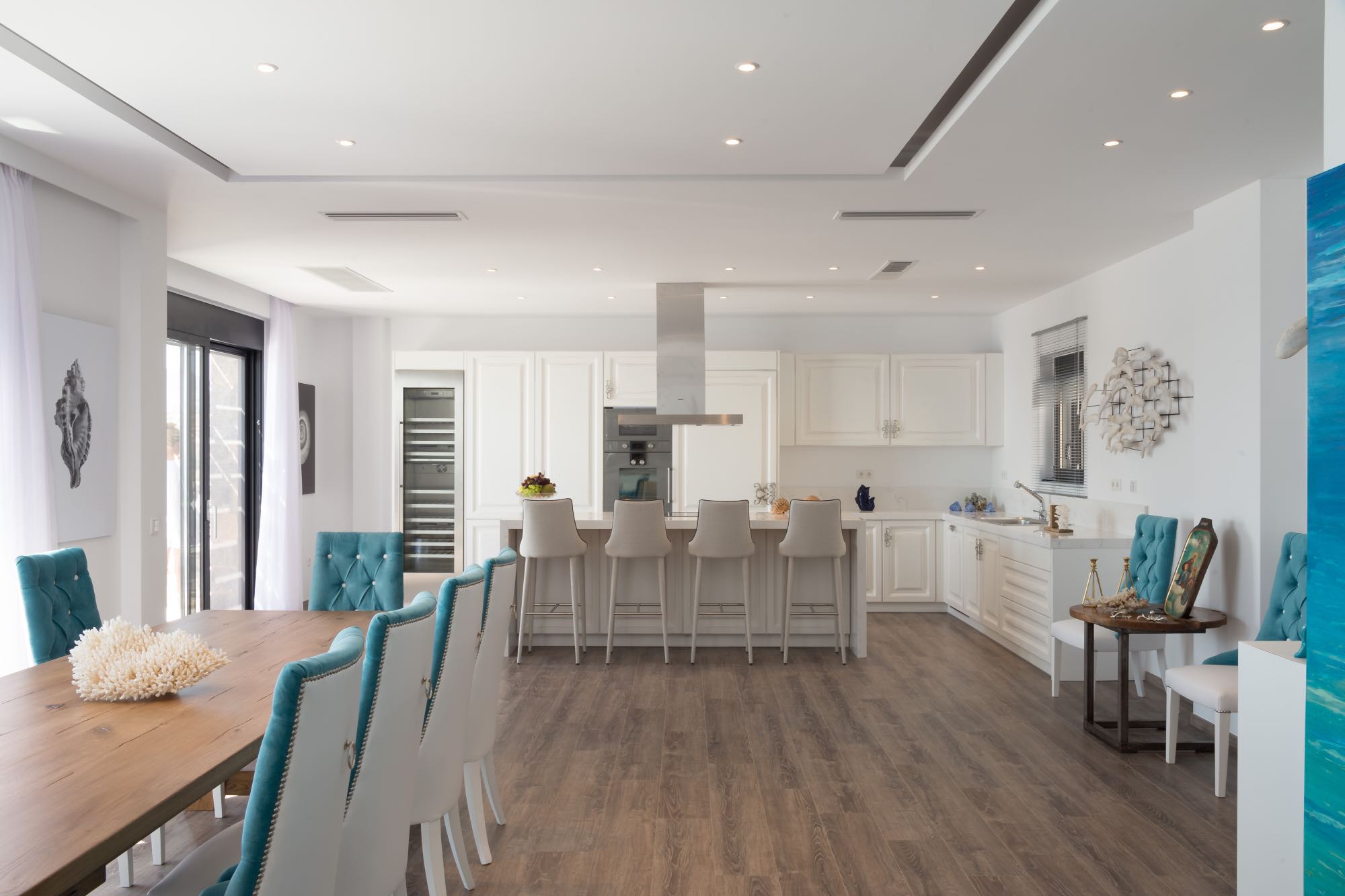 The residence unfolds in 3 floors, has 6 bedrooms, elegant kitchen, 5 bathrooms, 1 WC, elevator, two living rooms, swimming pool, central heating, outdoor barbecue with kitchen, access to private beach (and floating deck), smart home system and a boiler. Also, a gym and a spa (sauna-Hammam) room. On the lower level/floor there is an internal garden with plants and an open ceiling that gives amazing light into the house.