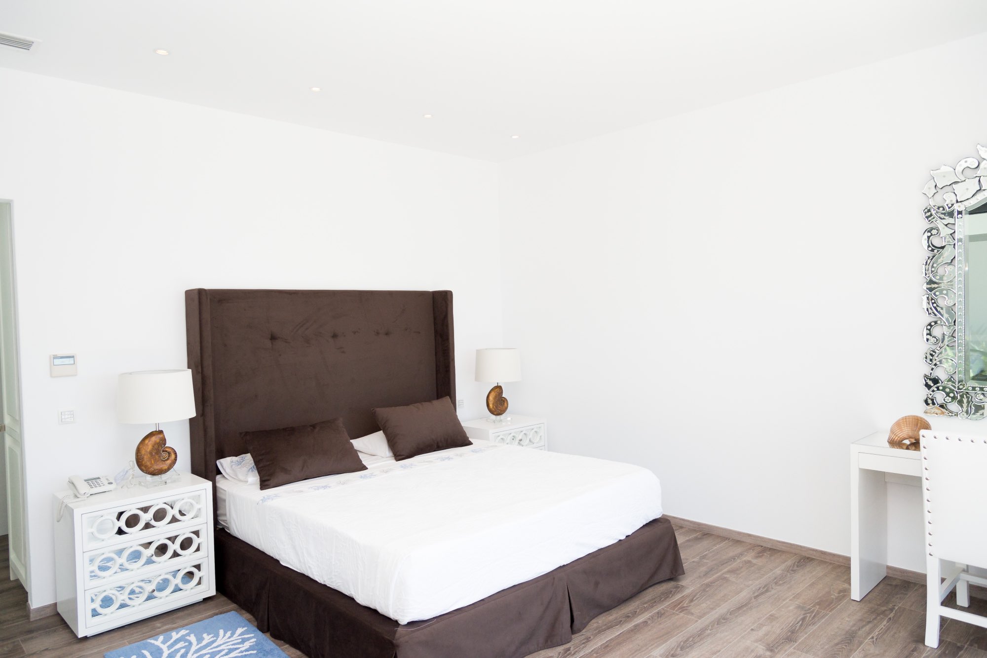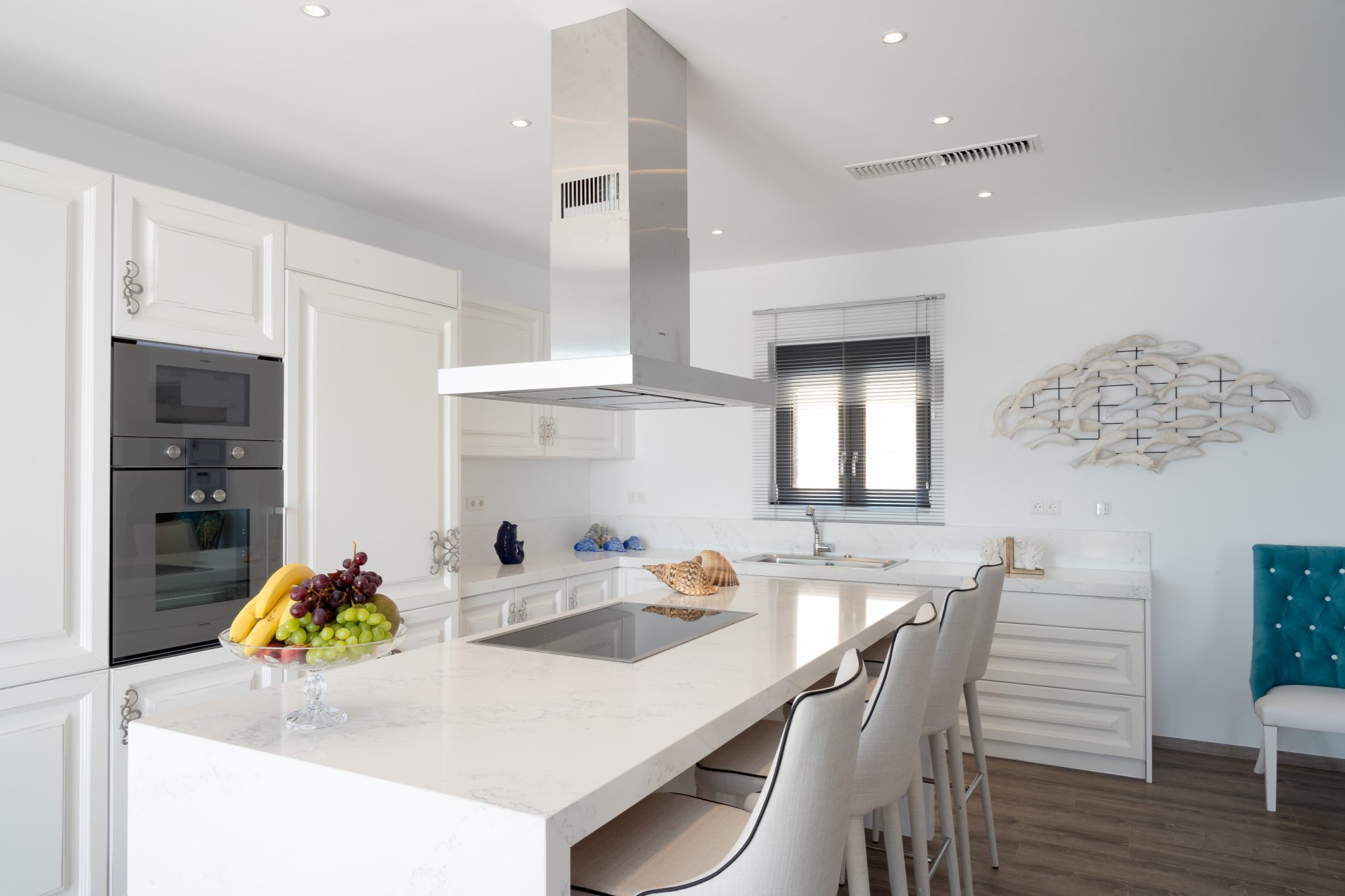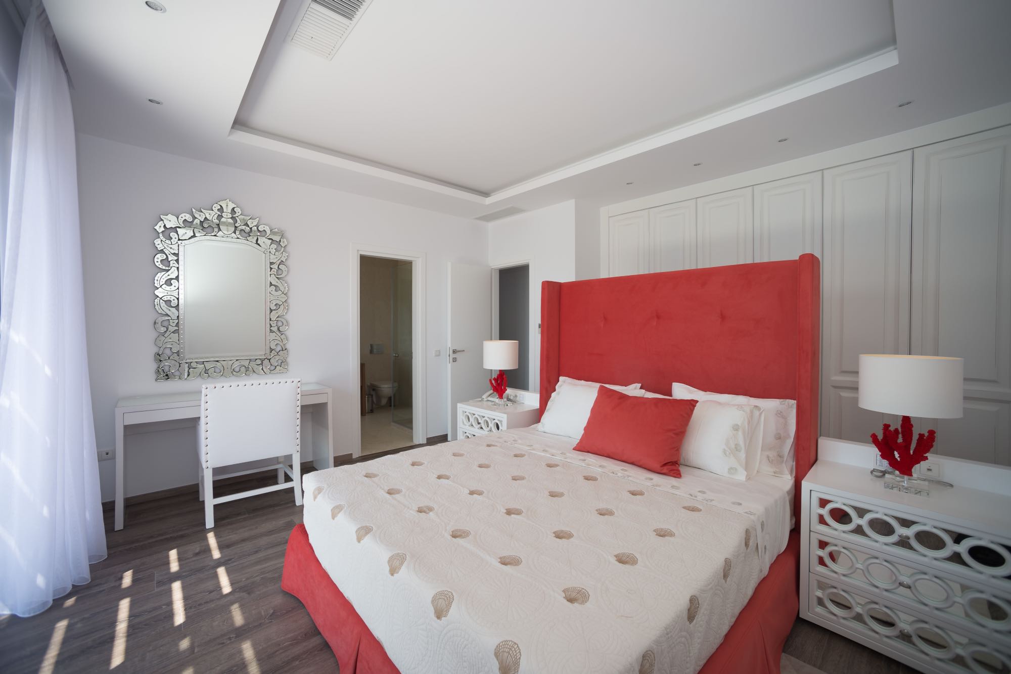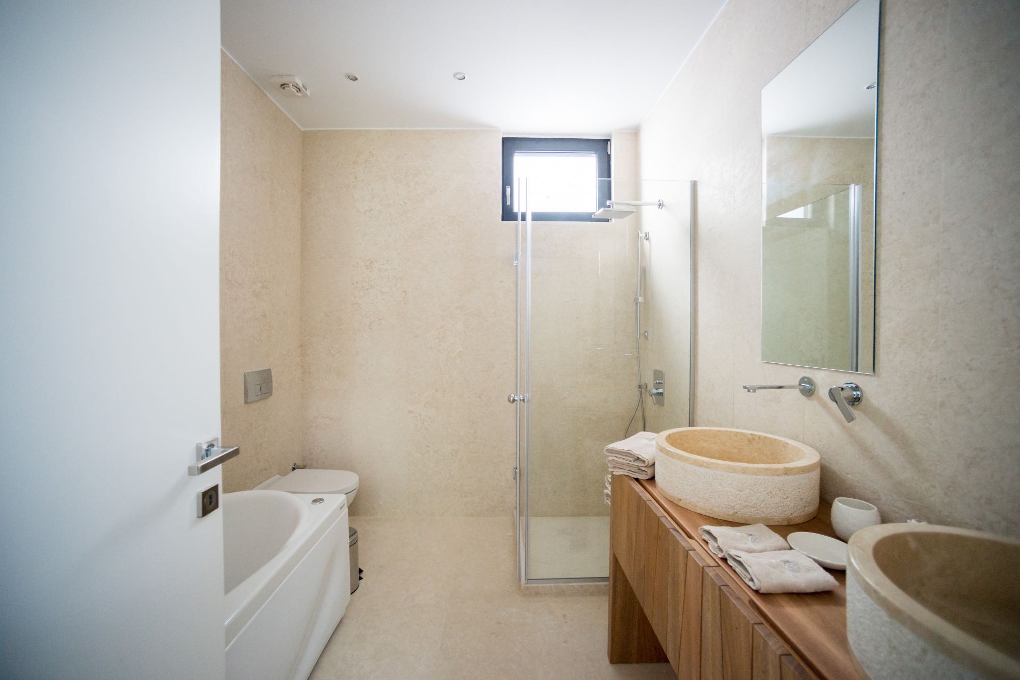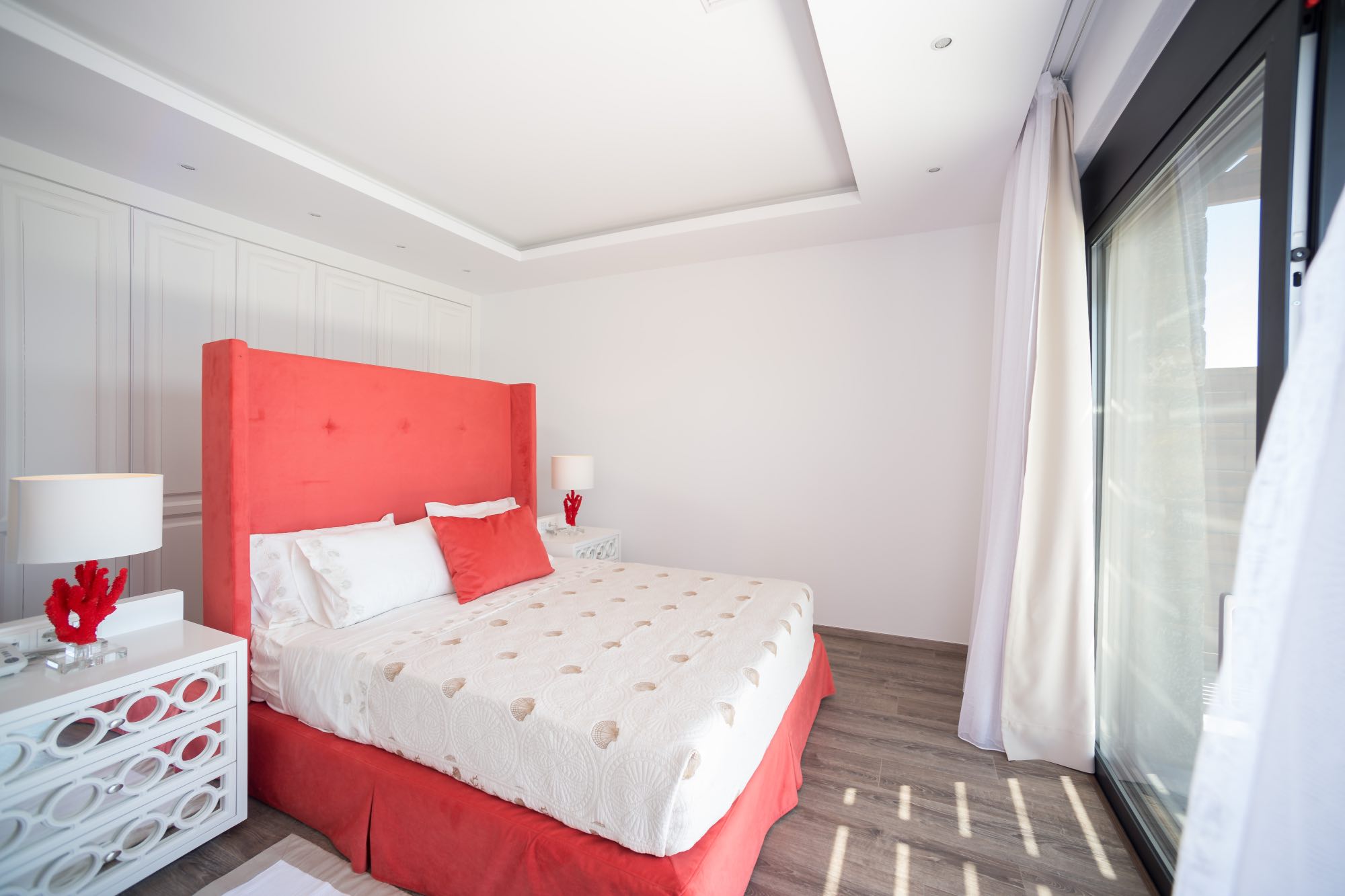 The residence unfolds in 3 floors, has 6 bedrooms, elegant kitchen, 5 bathrooms, 1 WC, elevator, two living rooms, swimming pool, central heating, outdoor barbecue with kitchen, access to private beach (and floating deck), smart home system and a boiler. Also, a gym and a spa (sauna-Hammam) room. On the lower level/floor there is an internal garden with plants and an open ceiling that gives amazing light into the house.
