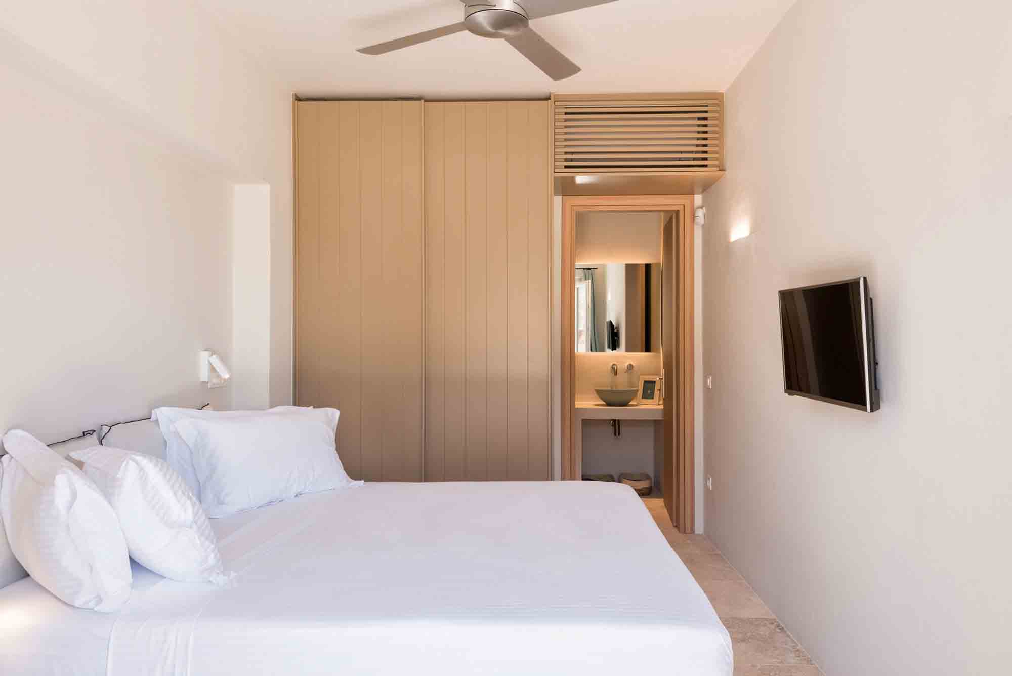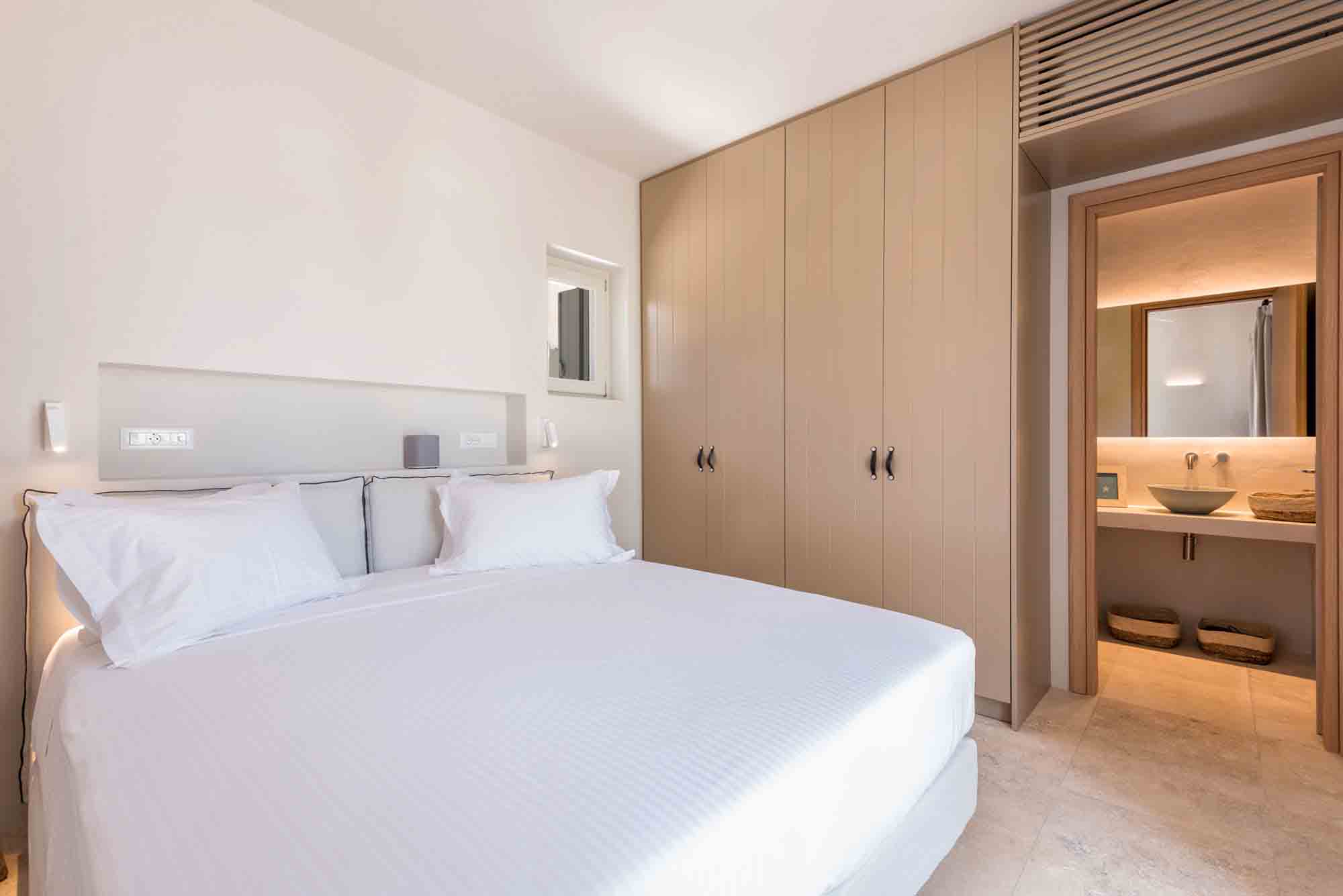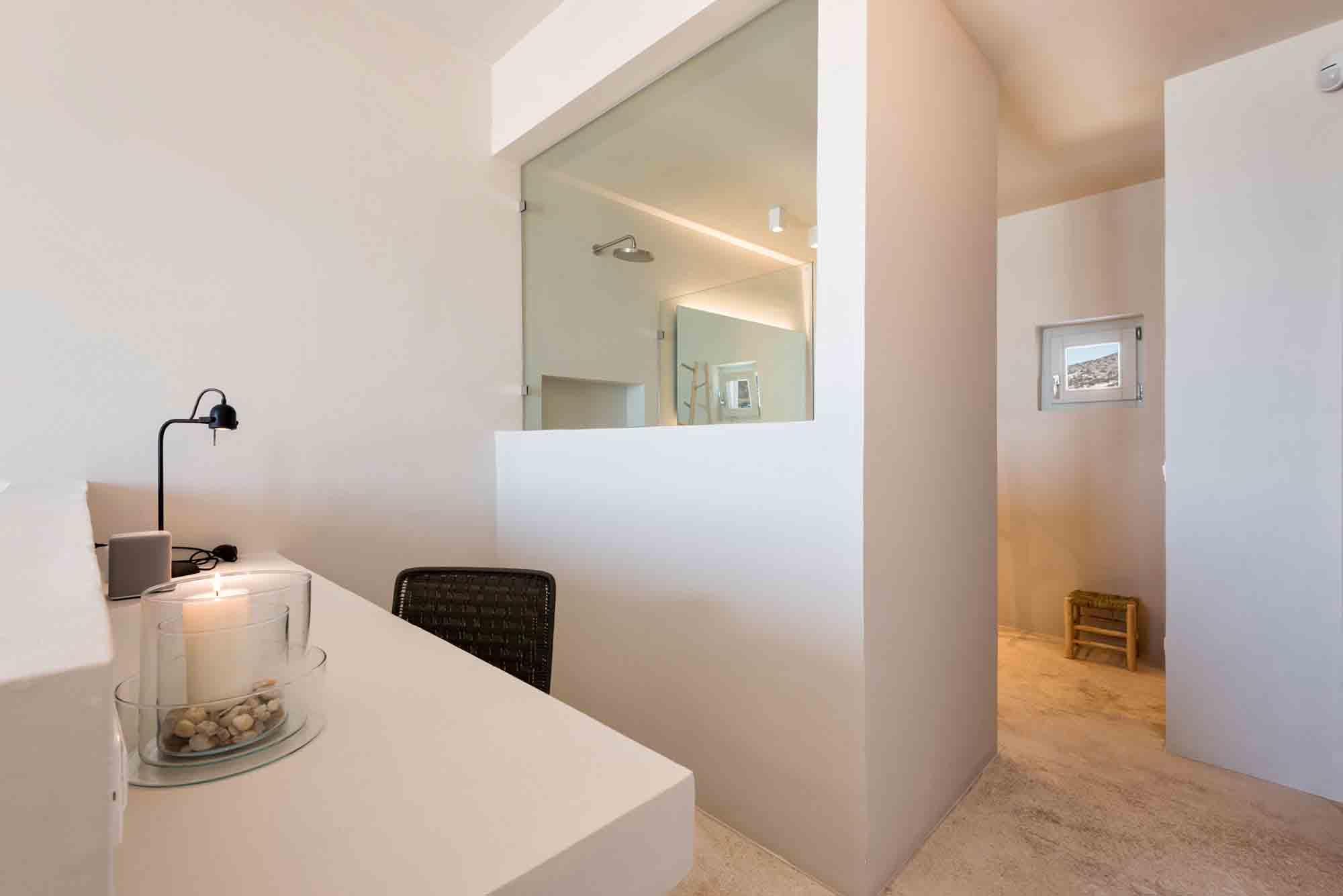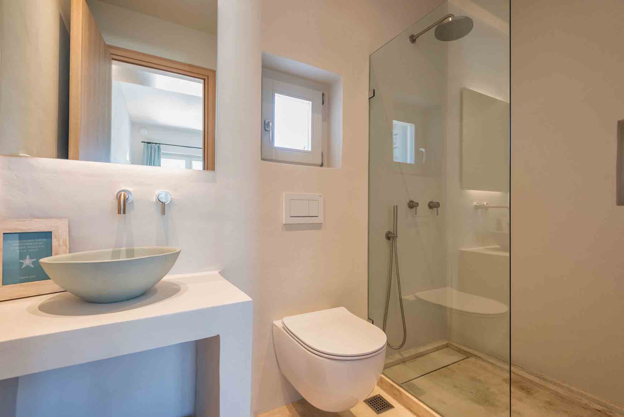 Each villa consists of 3 different settlements. The main house which is at the front side and offers a fully equipped kitchen, living and dining at the ground level, as well as an en-suite master bedroom on the upper level with private terrace and splendid views. Then there are two independent guesthouses, one with a double bedroom en-suite and one with two double bedrooms, both en-suite.