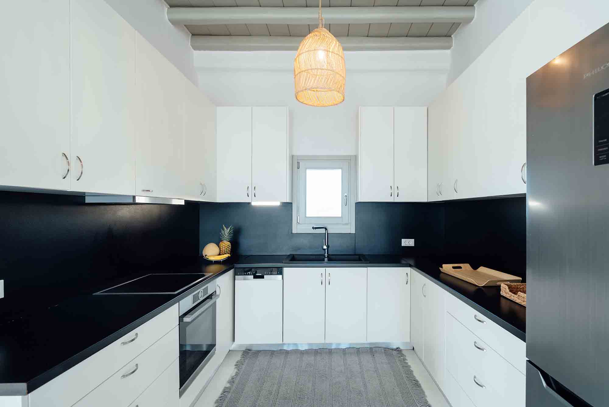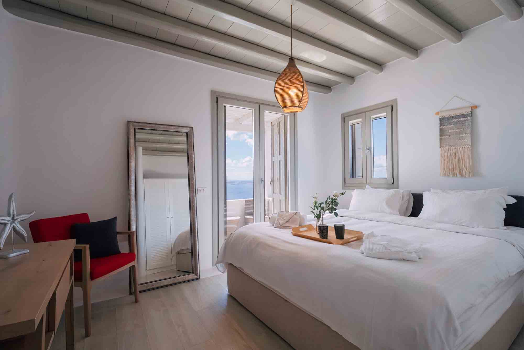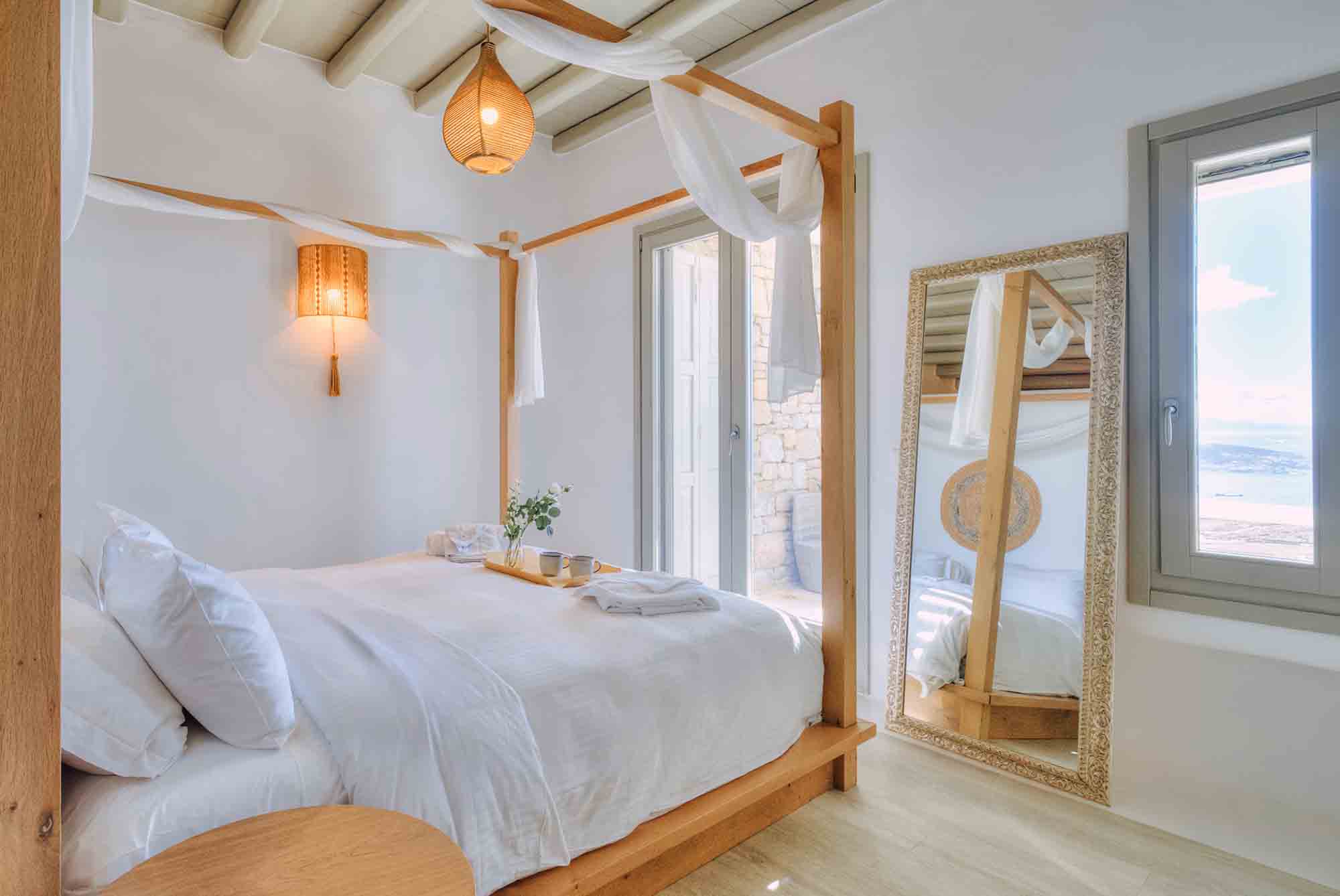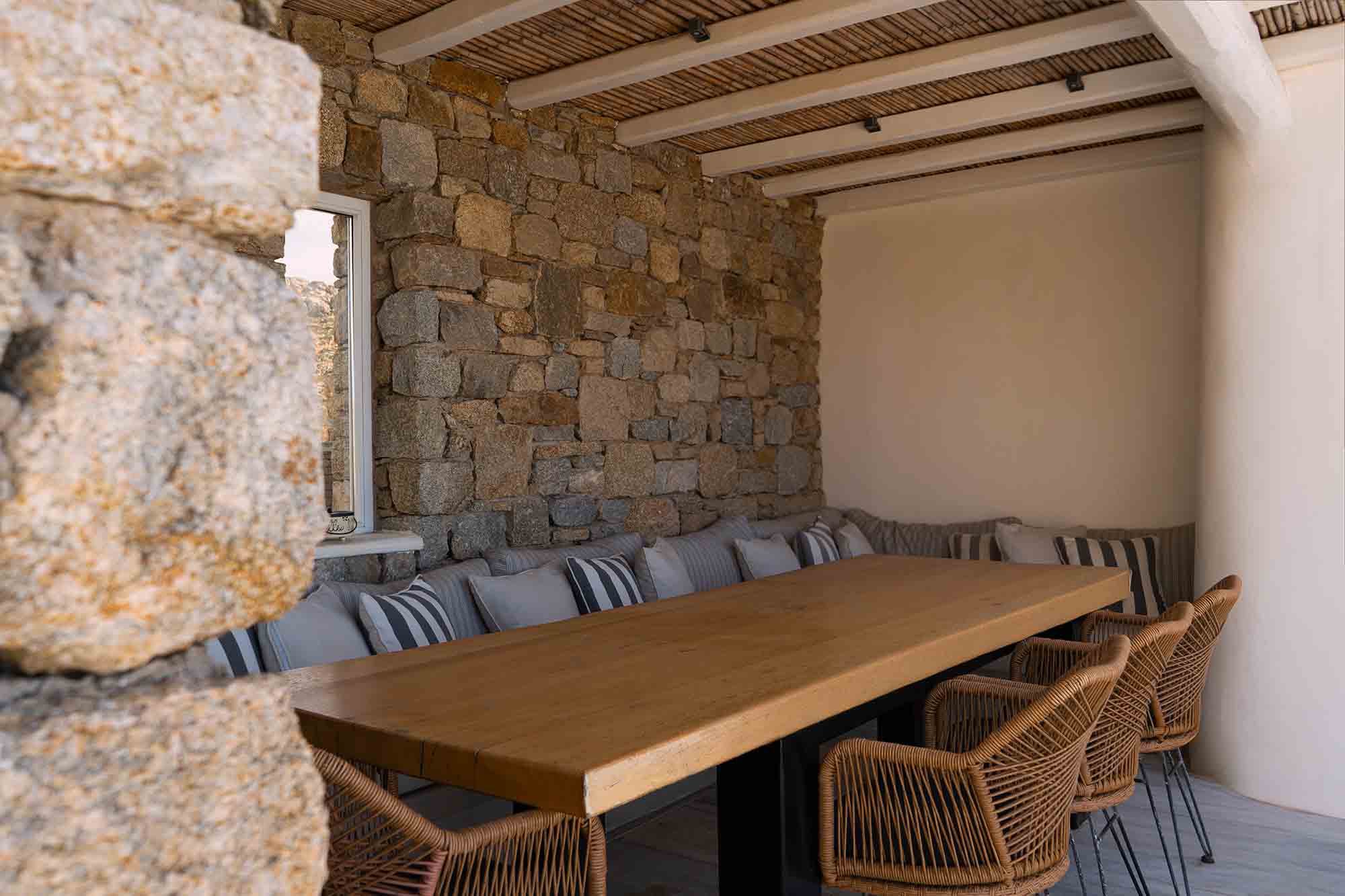 Villa Nicole is a luxurious 260 sqm Mykonian residence that blends minimalist and Cycladic architecture, featuring natural rock elements and classic whitewashed accents.