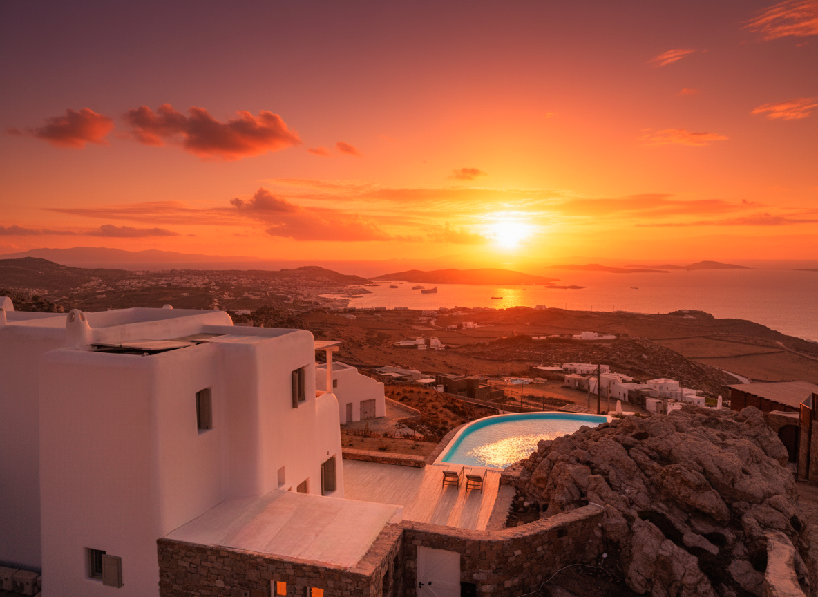 Perched atop the mountain in the Kastro area, it offers unparalleled sea and sunset views. The villa comfortably accommodates up to 12 guests