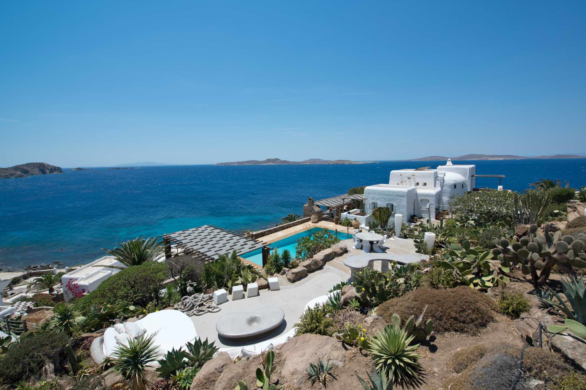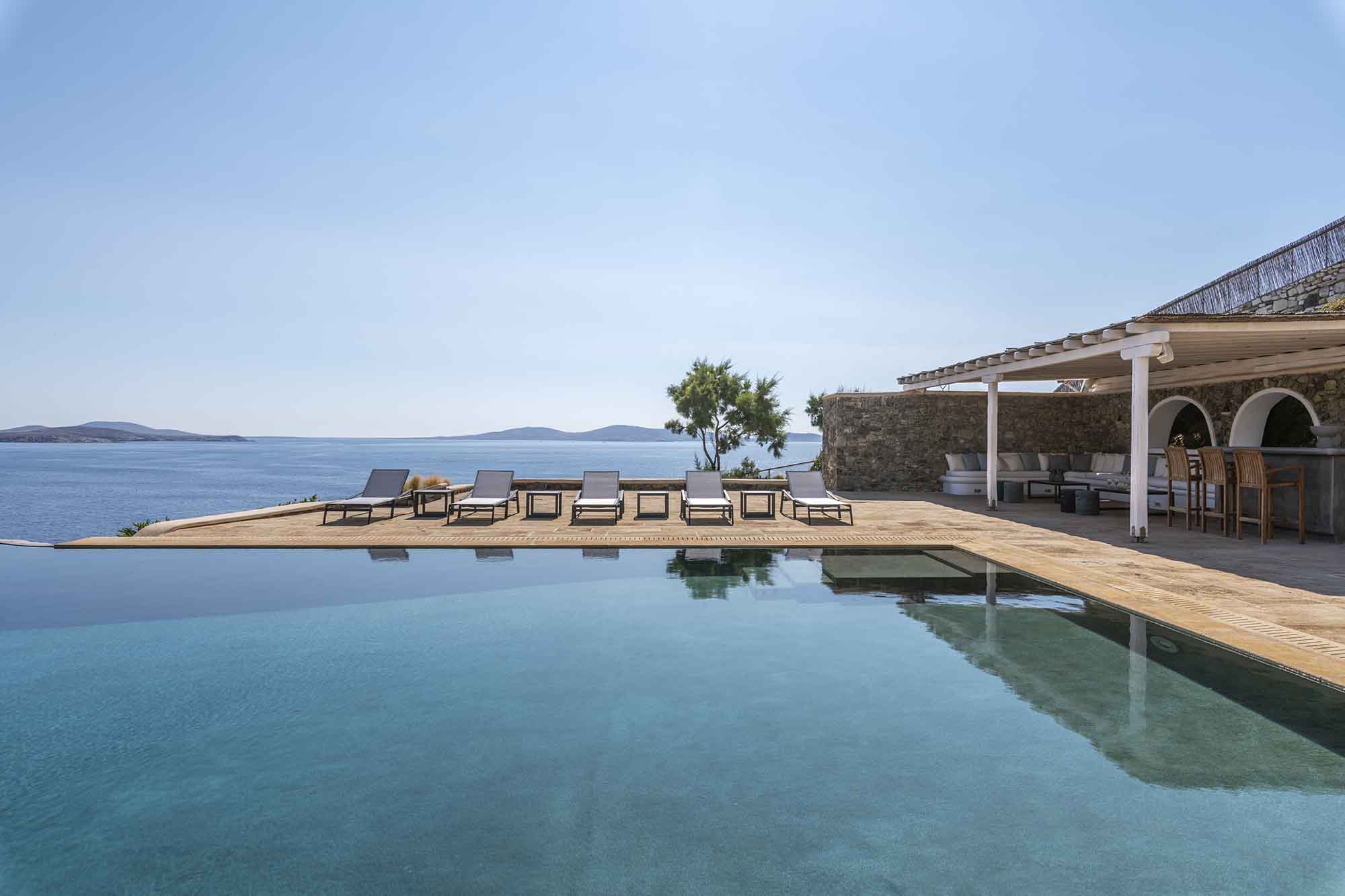 In the outdoor spaces, the stone element prevails, offering a contrast to green vegetation and the Aegean blue. While the pool is at center stage, there are various lounge and dining areas, most of them shaded to enjoy alfresco dining and the colors of sunset. The land plot opens its private gate to two secluded beaches one pebble and one sandy offering privacy and isolation for families and friends.