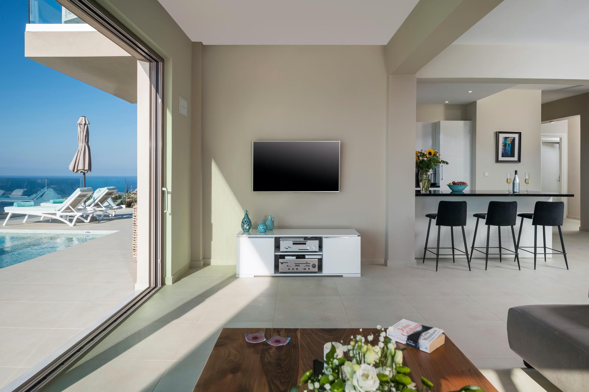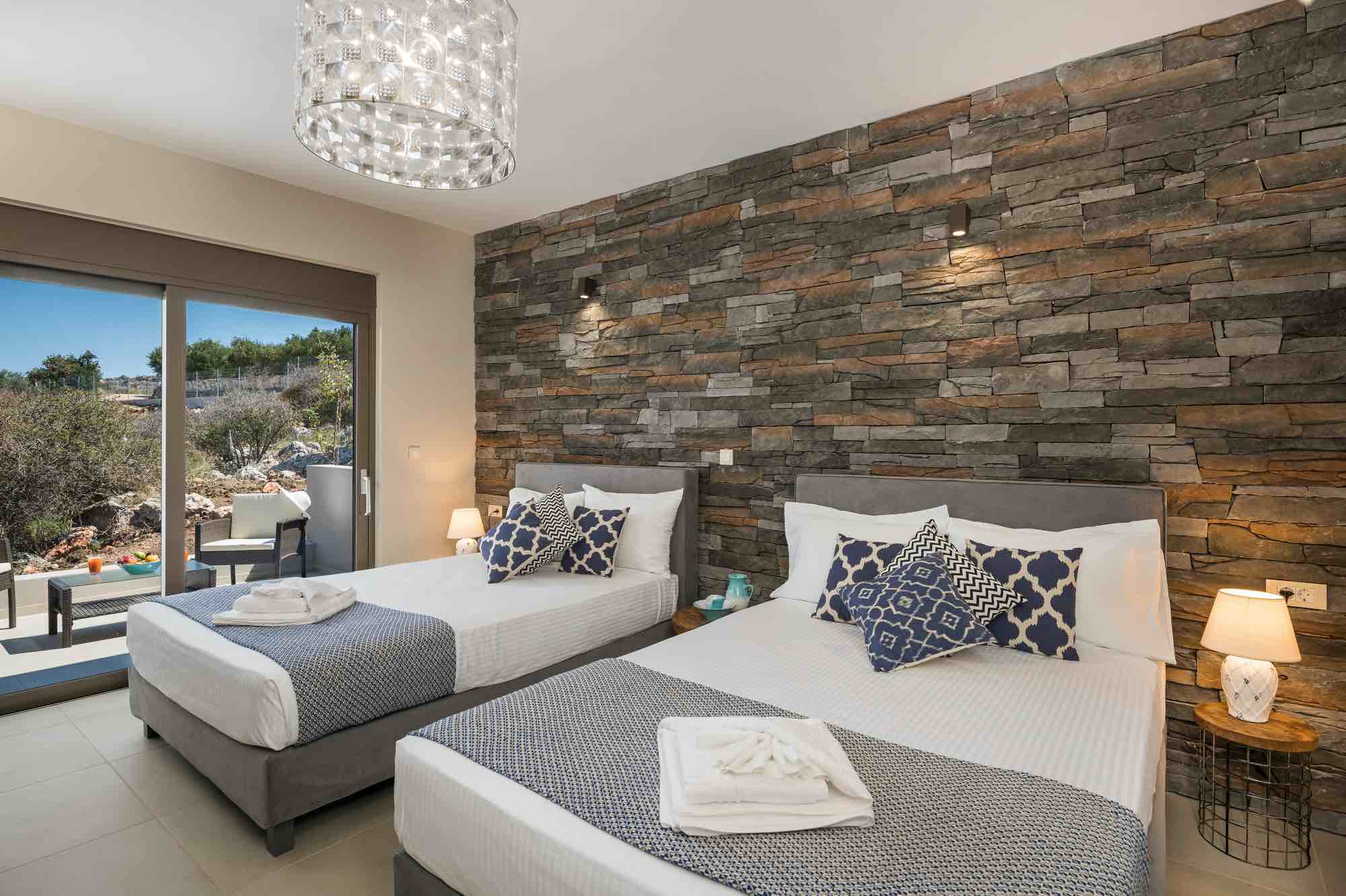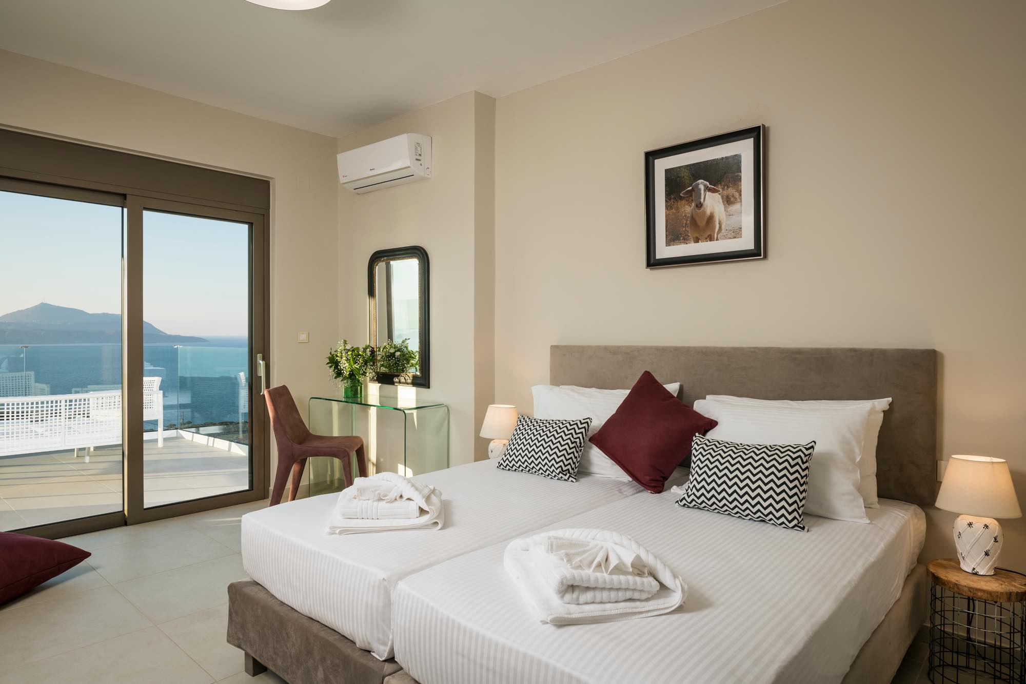 Villa Polynices expands in two levels and its well thought design takes advantage of the lovely scenery, allowing guests to enjoy superb views from all bedrooms and living areas. The main entrance to the villa is on the upper level where there are two double bedrooms with en-suite bathrooms and two more rooms sharing a bathroom.
