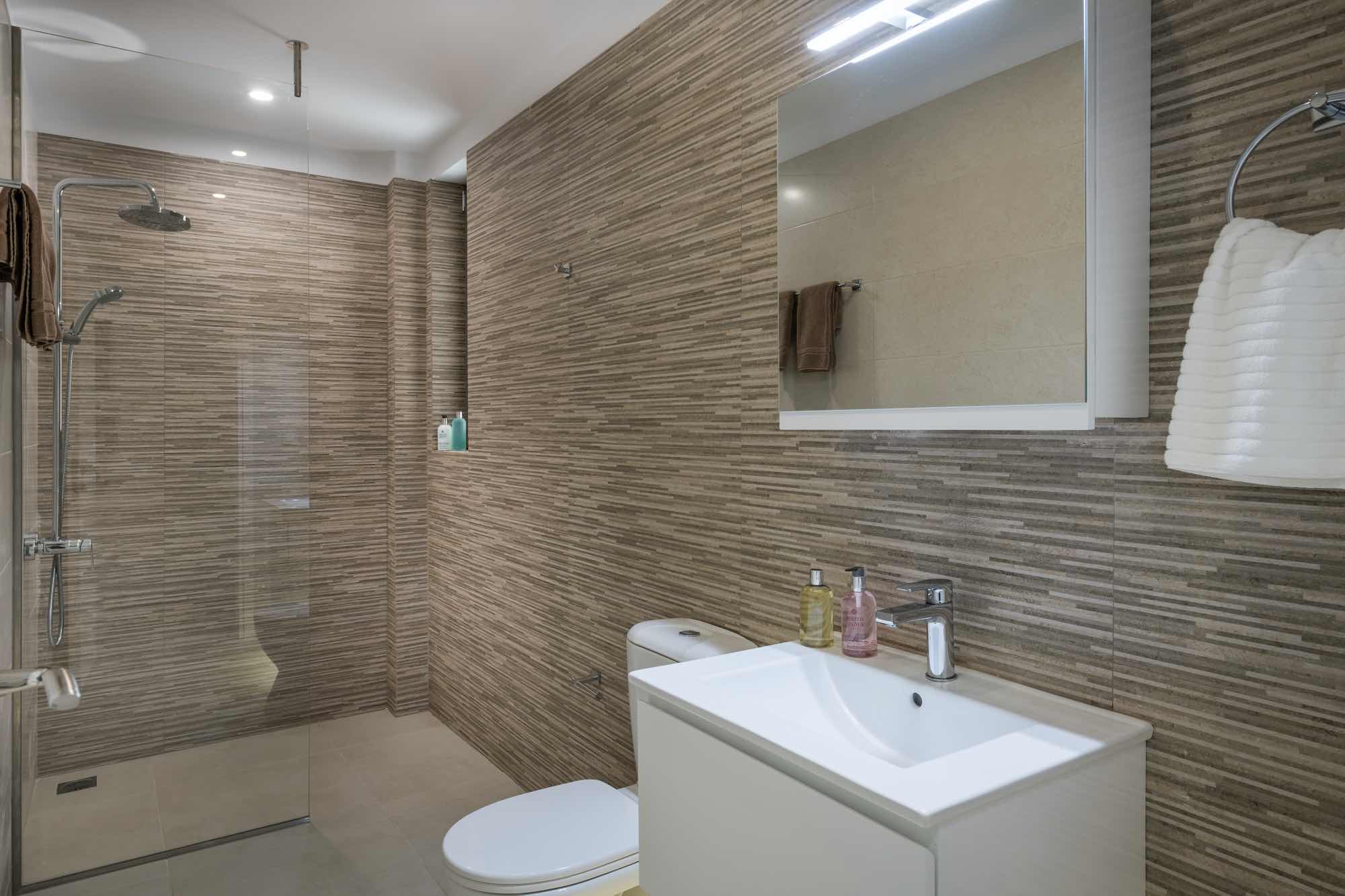 The lower level features the living and dining area, the open plan fully equipped kitchen, a cinema room and a double bedroom with en-suite bathroom.