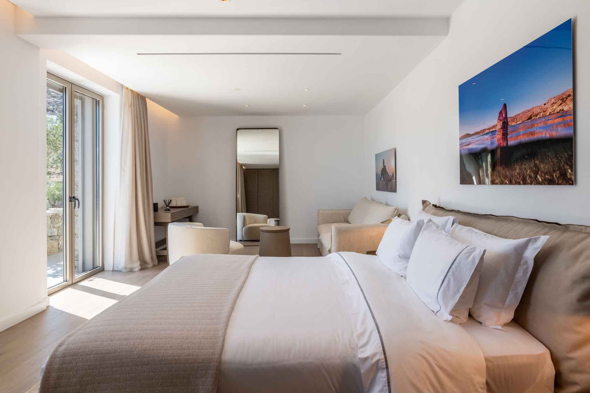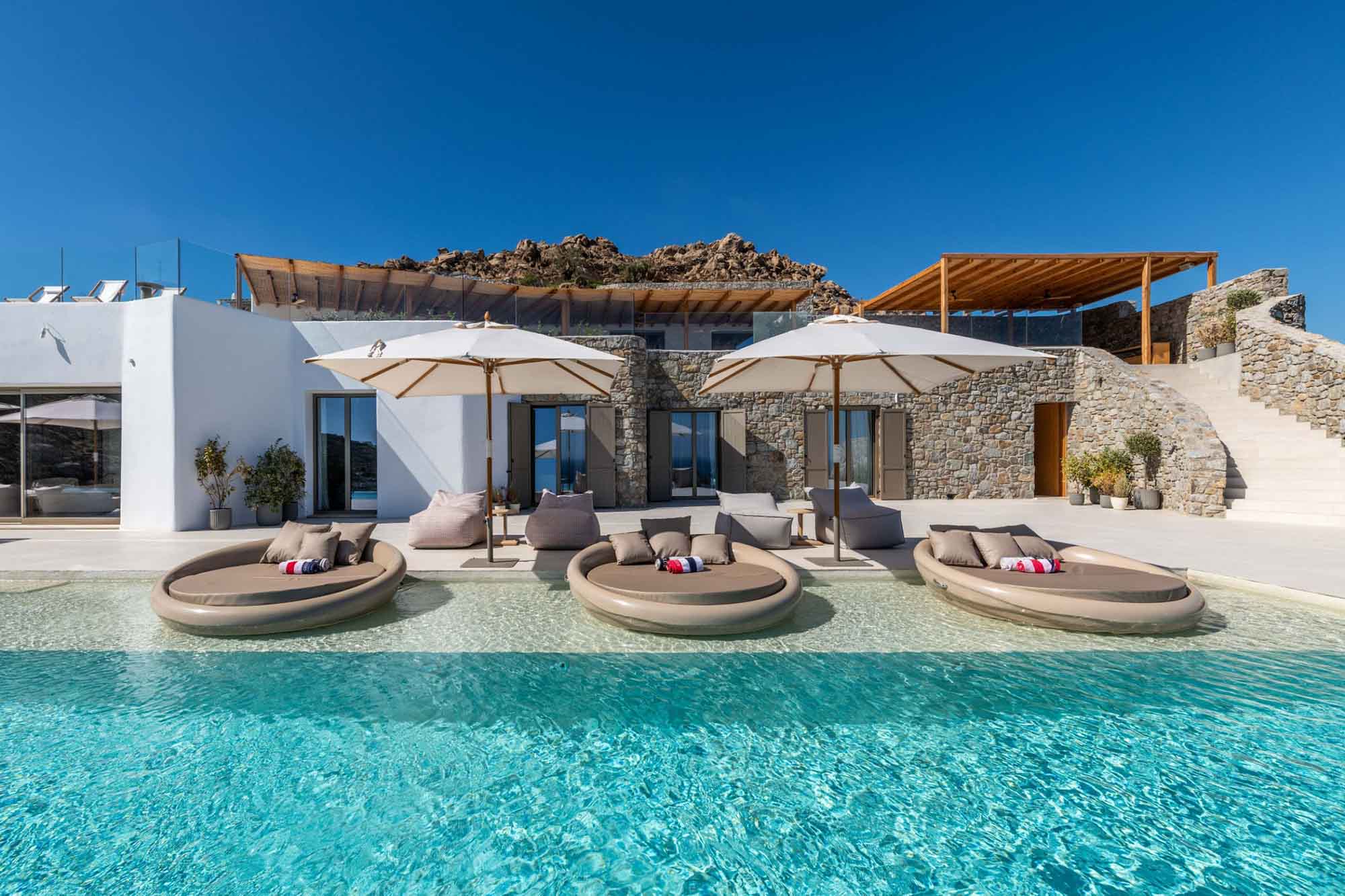 A stunning top-luxury private property that synopsises literally anything and everything needed for a dreamlike holiday on the island of the winds. Gracefully nestled on a sloping hillside overlooking one of the most famous beaches in the world, Psarou, and withing walking distance from this cosmopolitan beach and its luxurious all-day & night destination Nammos Village, Solar One Villa is a every Mykonos-lover dream come true.