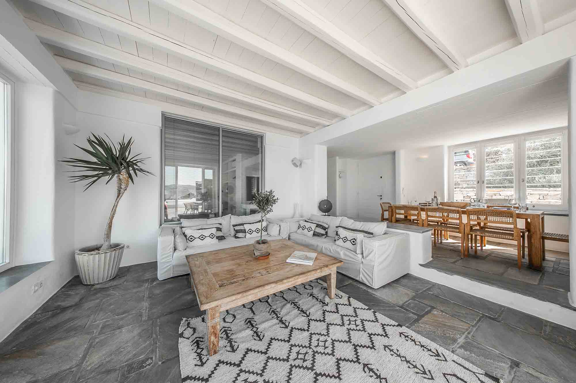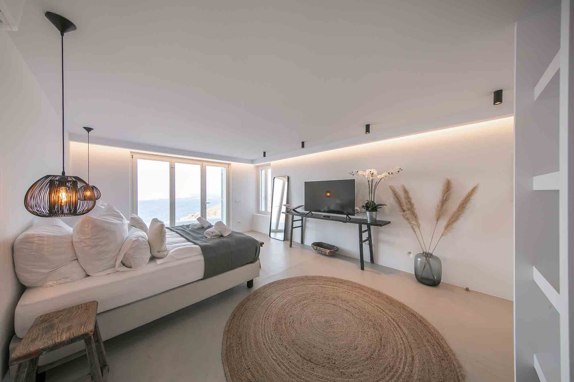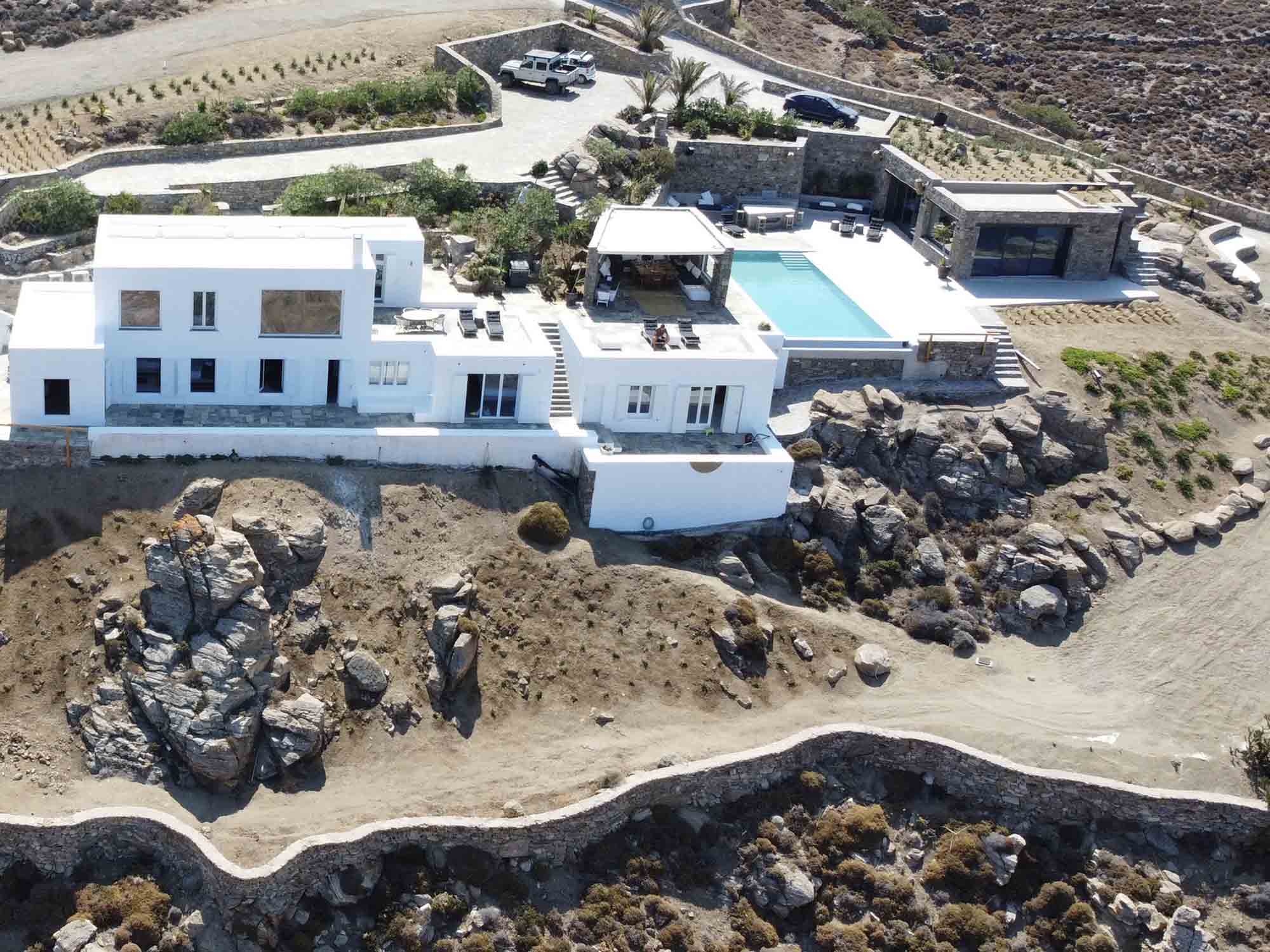 This exclusive villa rests on a private land of 8000 m2, at about 300m from the water’s edge, overlooking the bay of Ftelia opposite the sandy beaches of Panormos and Agios Sostis.