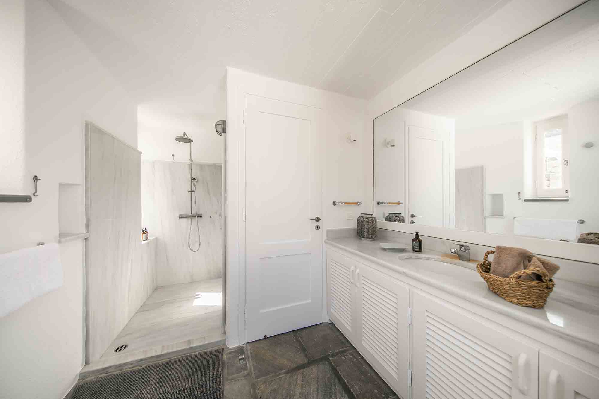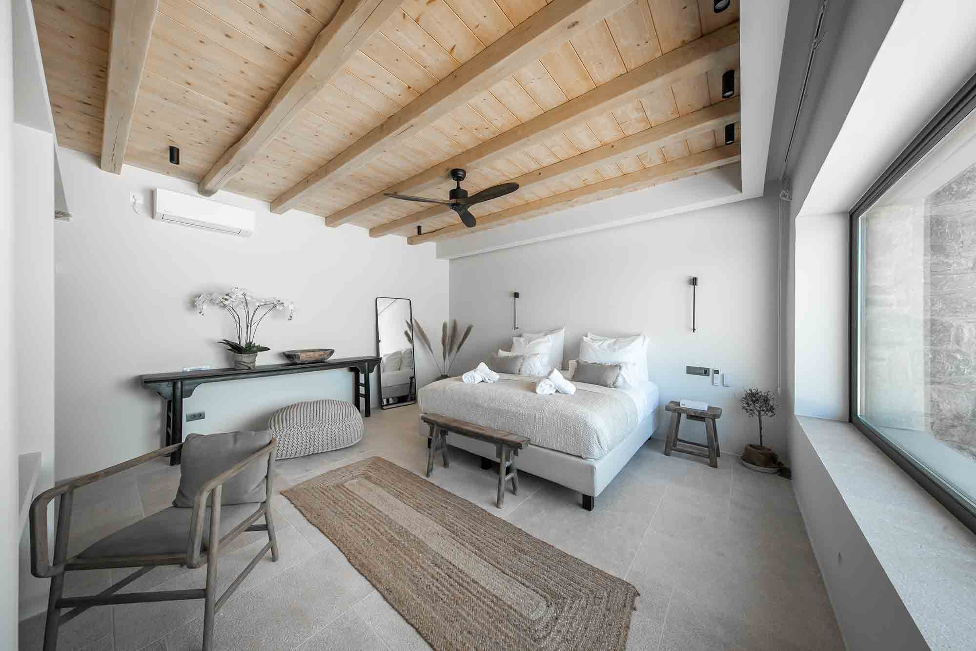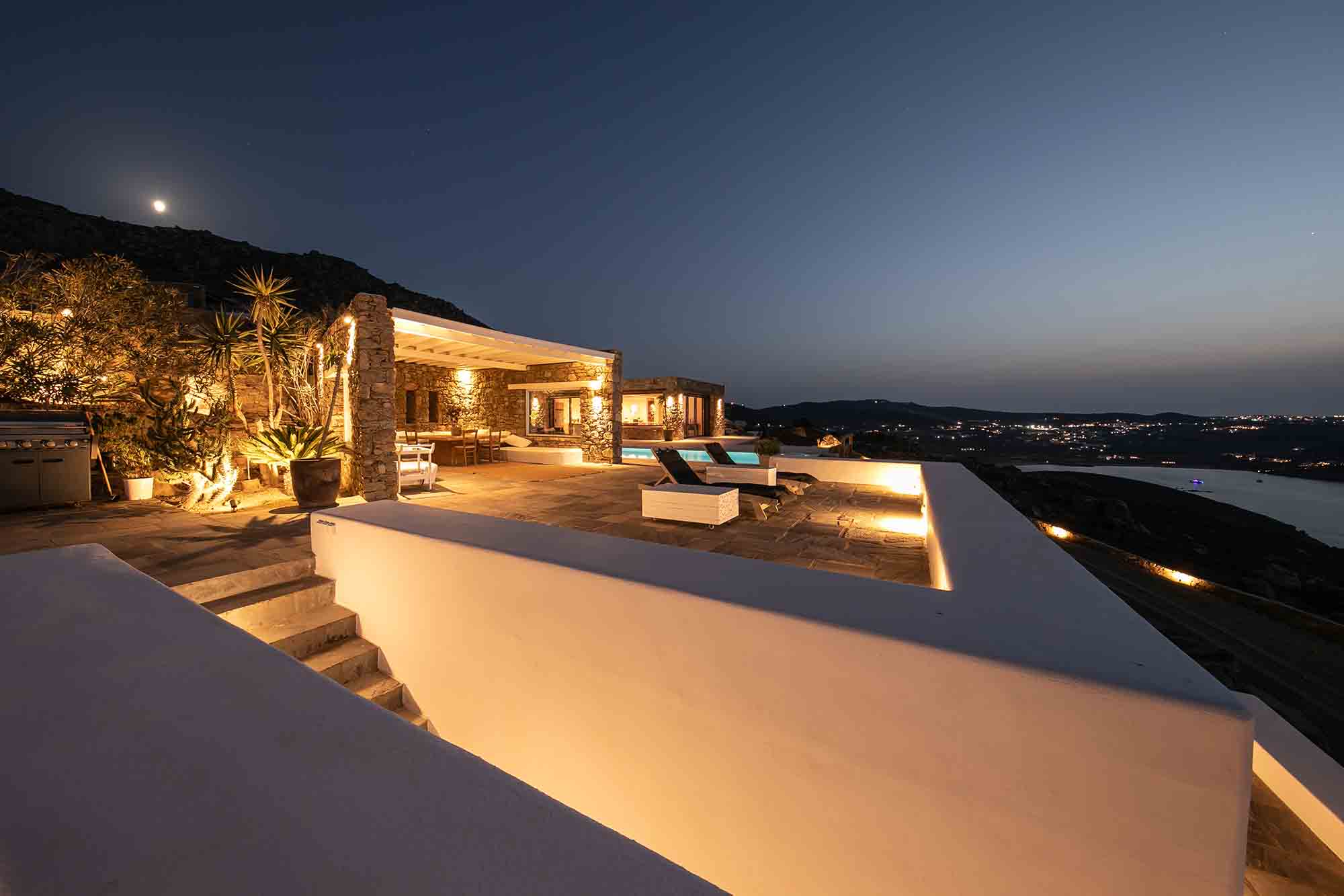 This exclusive villa rests on a private land of 8000 m2, at about 300m from the water’s edge, overlooking the bay of Ftelia opposite the sandy beaches of Panormos and Agios Sostis.